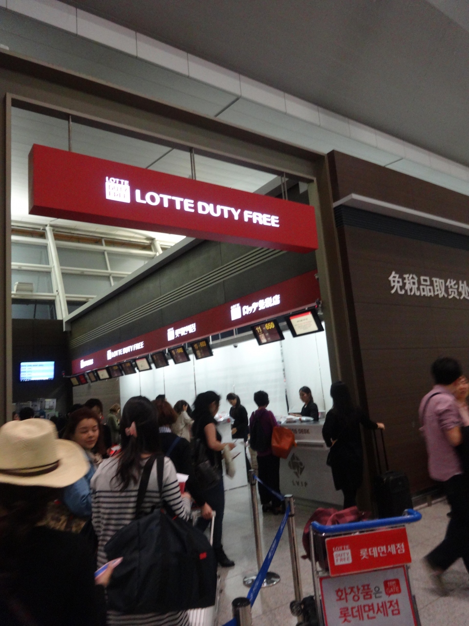 空港の免税エリアにあるロッテのデューティフリー。ソウルのロッテ免税店で購入したアイテムをピックアップする場所もあります。こちらは大行列。中国人の爆買いご一行様であふれ返っています。ピックアップは早めがおすすめです。