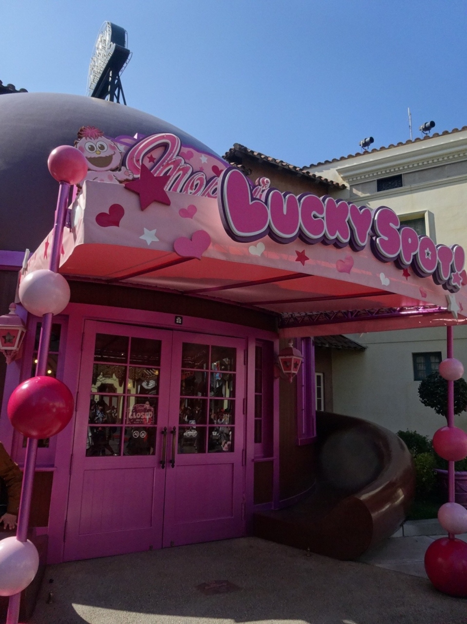 USJオリジナルのセサミーの新仲間モッピー。ふわふわピンクが特徴でみんなを幸せにするというコンセプトで誕生したそうです。今はショップの前にベンチが置かれていて記念撮影もできます。毎日、笑顔ナンバーワンの人にエクスプレスパスを進呈するハッピー占いを店内でしているそうです。
