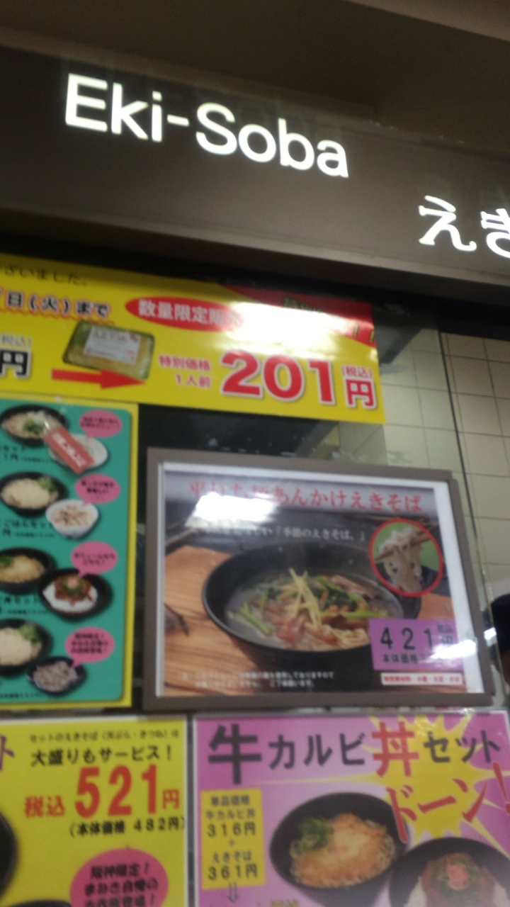 姫路でおなじみの駅そば。阪神のスナックパークに大阪店があります。えきそばとは黄色いそばに和風だしを合わせたラーメンのようなうどんのようなオリジナルこらぼたそばのこと。今でも立ち食いが基本です。360円から食べられる安価も人気のヒミツ。