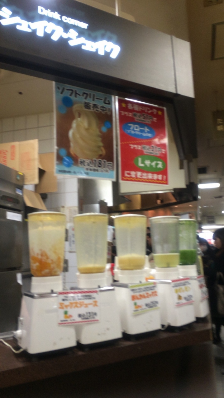 阪神百貨店の地下1階にあるスナックパーク。こちらの中にあるジュースバー。フルーツを使ったジュースがずらり。店頭にはジューサーがズラリ。ビタミン補給したきときにはぴったりですね。冬はいちごのジュースがお気に入り。
