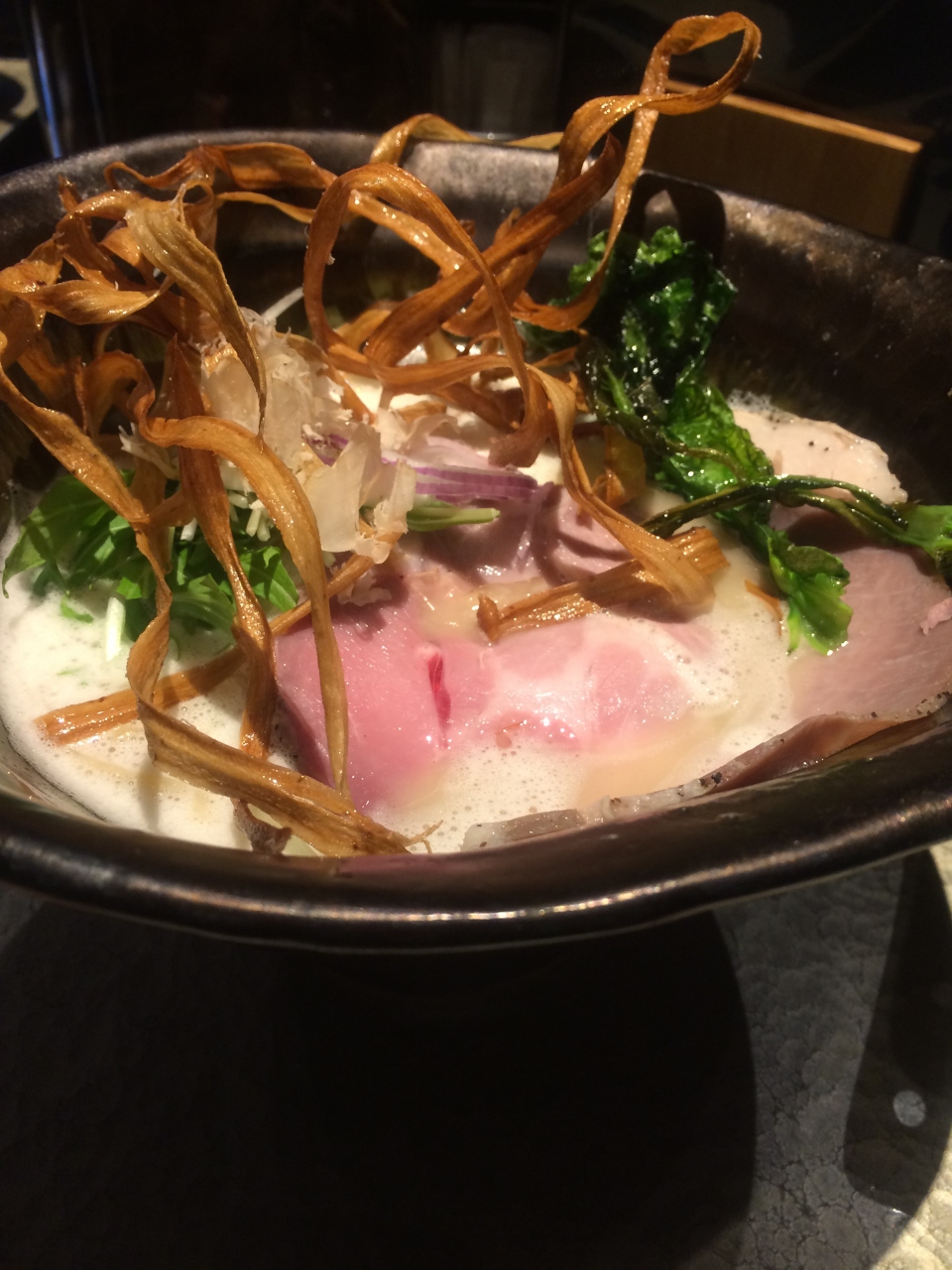 おいしいラーメン店があると勧められて来店。肥後橋駅からすぐです。店内もシックですが、高さのある器に彩りよく提供されその美しさに感動です。ラーメンの域を超えています。白濁スープに細麺、鶏肉、薄切りされたチャシュー、メンマなどがのっています。スープは飲み干したくなる旨さ。スタッフも紳士的な感じでとても好感度の高いお店です。