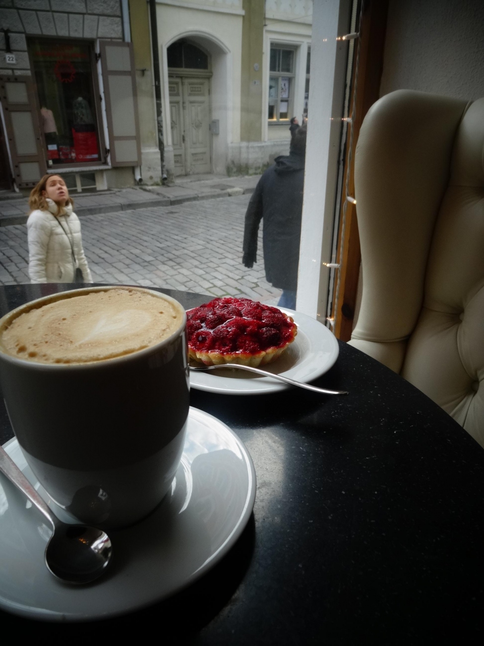 寒さと空腹でお店に入ったら、ここはカフェ。スイーツのみです。ショーウインドーにはケーキがずらり。ベリー系のタルトケーキにしました。おいしい。見た目で想像していたよりあっさり。そしてここはトイレが独房のような洞窟のような広くて暗くて、井戸もあって不思議でした。