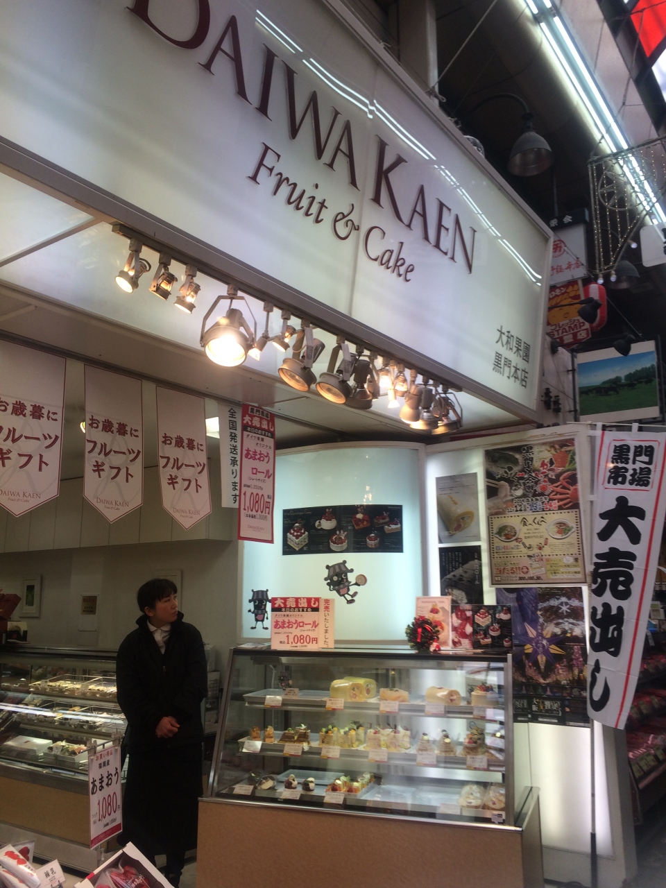黒門市場内にあるフルーツショップ。ここは新鮮フルーツもですが、フルーツを使ったスイーツが有名です。ロールケーキやパウンドケーキなどお持たせにもおすすめの商品がたくさんあります。新鮮でおいしい果物を使っているのって改めて贅沢。