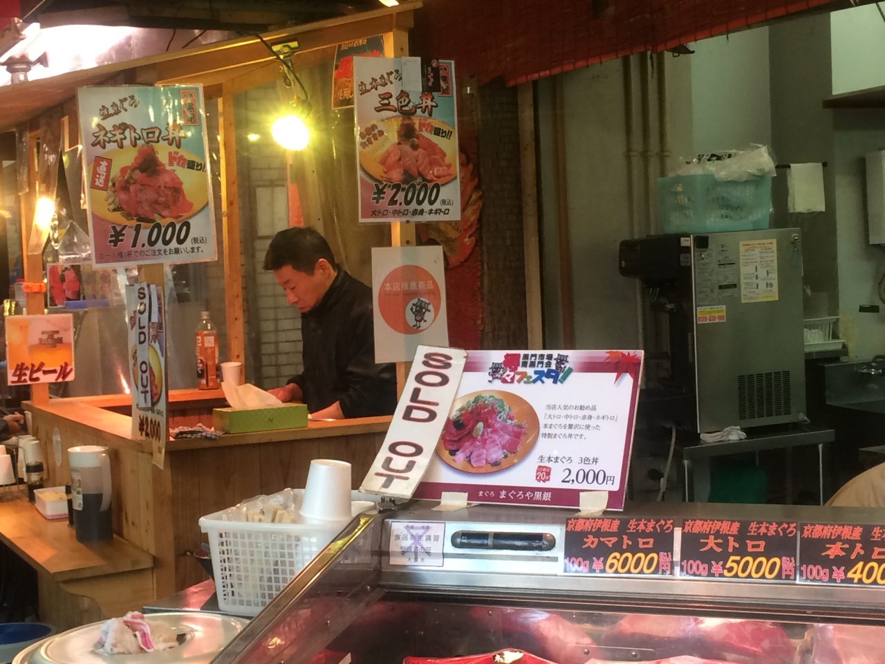 黒門市場内でとくに人気を集めていたこちら。まぐろが店頭にずらっと並んでいます。丼は1000円と2000円、そしてねぎまぐろ汁は200円。とりあえずねぎまぐろ汁をいただきましたが、最初にふわっと甘い風味が口に広がります。隣は同店の肉店です。こちらもイートインOK。
