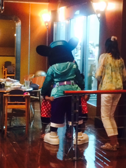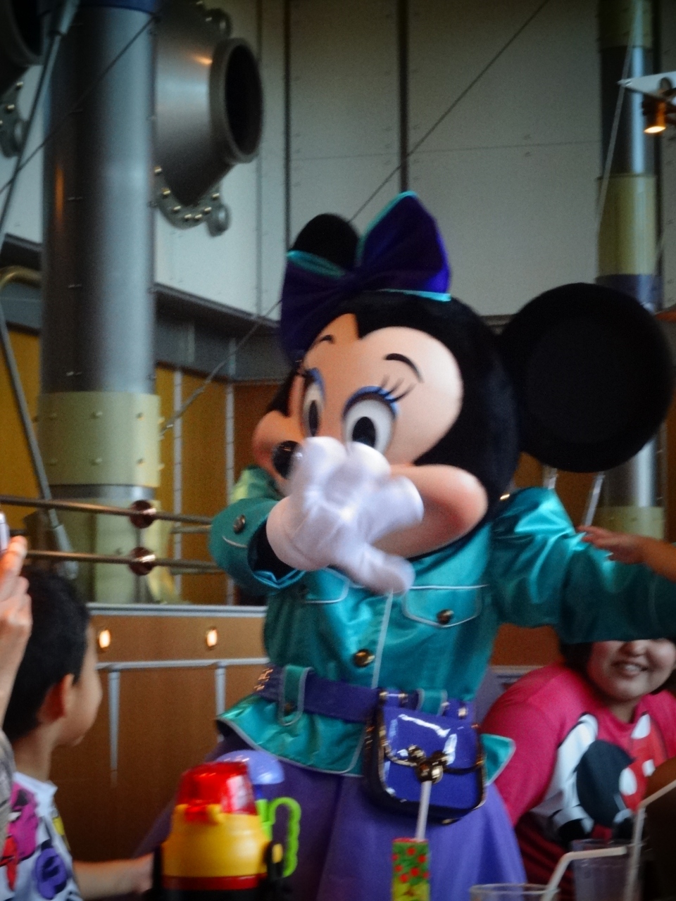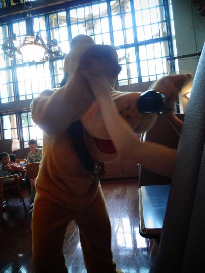 ミッキー、ミニー、プルートが順番に席に来てくれます。