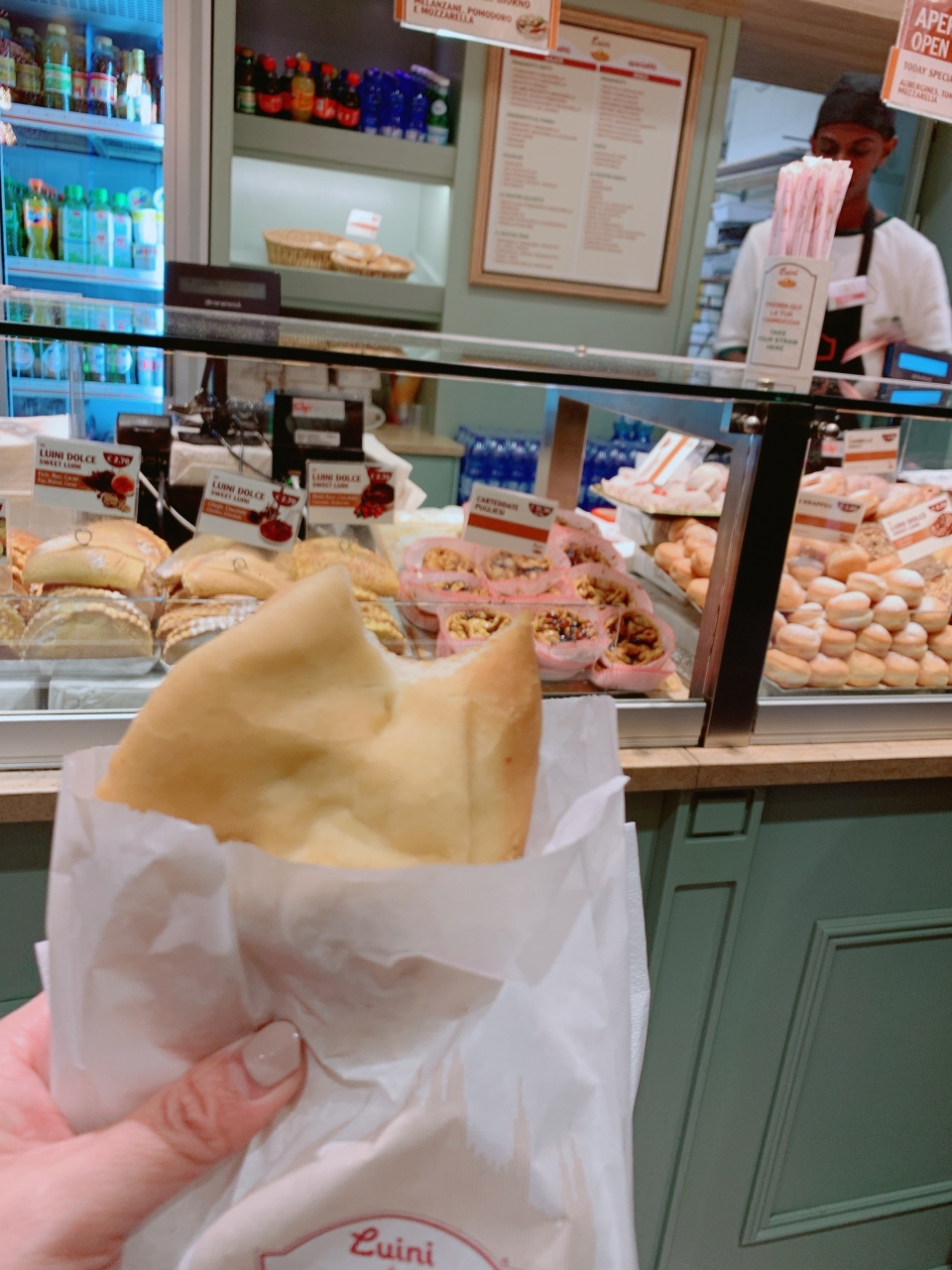 行列が少なかったのでルイーニにトライしました。効率よく買い物できる感じで、これがイタリア!?と驚きました。店内で立ったまま食べてみました。チーズがとろ~としていてアツアツでとってもおいしいです。また食べにいこう