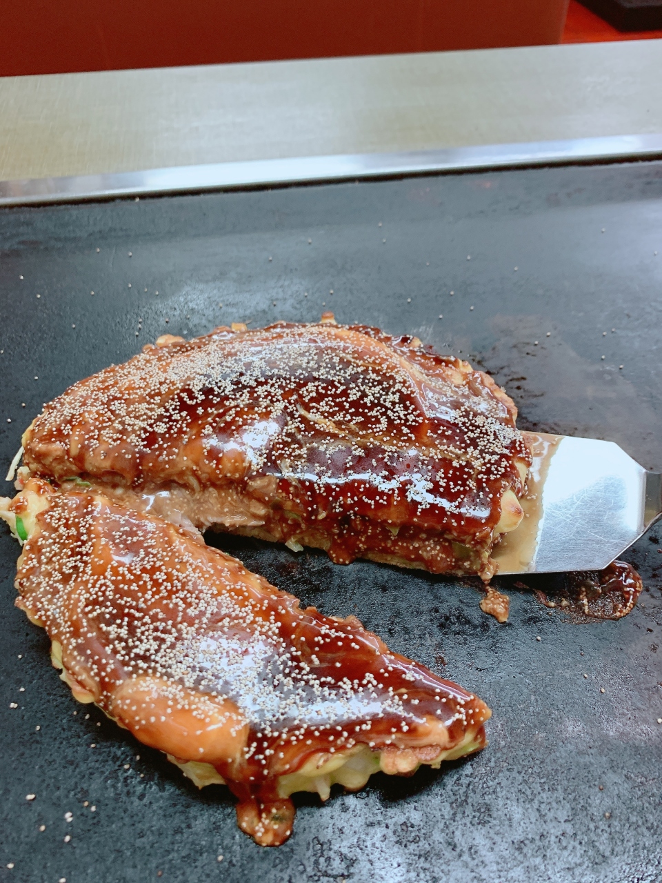 天神橋筋商店街の千草へいきました。久しぶりのお好み焼きです。スタッフさんが焼いてくれる千草焼きにしました。大きな豚肉がはいっていて、最後にケシの実をかけてくれます。こんなにおいしいんだと、感動しました。熱々最高