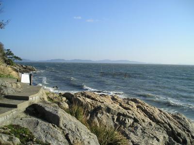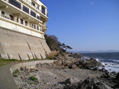 ホテルを出て海岸に下りると、海沿いにホテル群を一周りできる遊歩道があります。三河湾の風と波しぶきを感じながらの40分です。