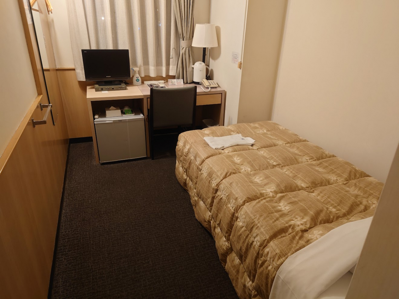 部屋の鍵はガチャガチャ鍵式の昭和ビジネスホテルで、フロントは23時まで。それ以降は宿泊客はテンキーでホテルに入る方式。22時半までは大浴場(数人規模だが・・・)が使えるのが利点。部屋の設備は冷蔵庫を始め一通りそろっていて、WIFIもまあまあというところか。コンセントは少ないので、たくさん充電機器を持っている人は工夫が必要。
