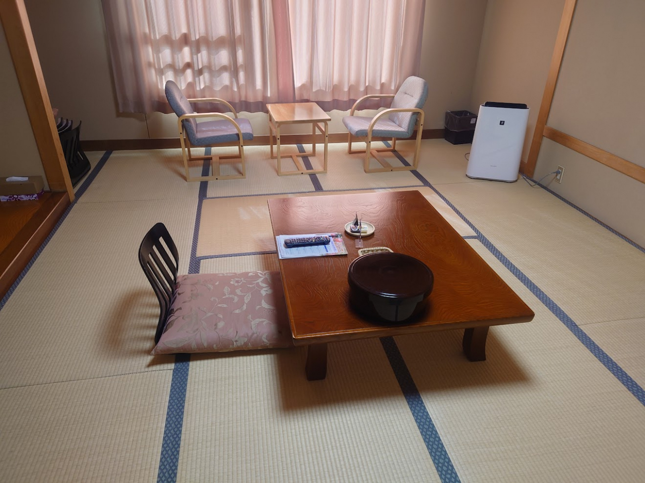 和室の3~4人部屋に一つ布団が敷かれるパターン。WIFIは問題なし。コンセントがやや少ないか。部屋に内風呂が付いているが、利用はしないと思う。温泉は夜中に男女の風呂が入れ替わるので、夜と朝に行って両方経験してほしい。加水加温なしの循環式。昼神温泉の無色無臭のアルカリ温泉でいわゆるおはだすへすべ系である。
