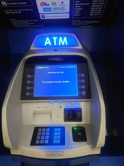 こちらは今レシートを見てもどこの銀行か書いてないのだが、かの悪名高いDCC画面は出てこないのだけど、2000ZARに対して、95ZARの手数料を取る、と表示される。一旦キャンセルして悩んだが、後のスケジュールが詰まっていることもあり、利用することにした。