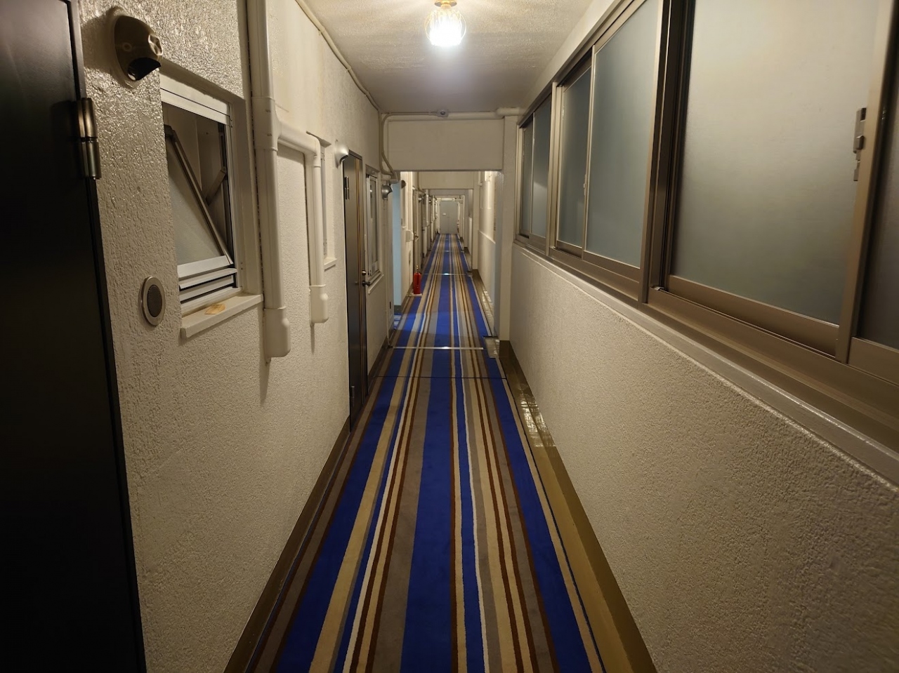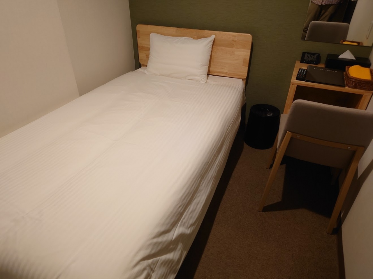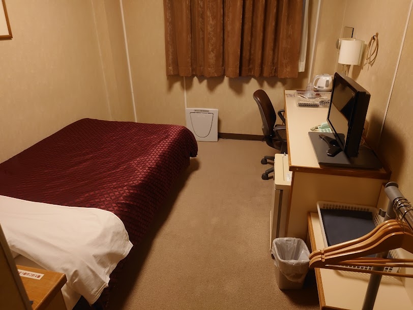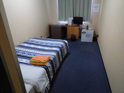 ロビーは狭く、フロントも小さい。健康ランドの方はやはり建物は古いもののそこそこ改修しつつ運営しているが、このホテルはそんな雰囲気でもない。客室は最低限そろっていて、昭和な冷蔵庫もある。コンセントもそこそこあり、WIFIは普通くらいというところか。とりあえず寝るだけなら十分である。