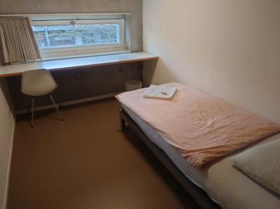 宿泊棟は元ワンルームマンションの居抜き物件のような感じで、長い廊下がある。部屋はいたってシンプルで、ベッド、机、テレビくらい。ユースホステルのシングルルームを想像するとびったしである。