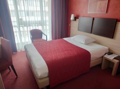 コルナヴァン駅を背中にして、右手の方にいかにも安ホテル(?)っぽいのが並んでいるが、そのトップバッターで、駅に一番近い。私は日本の地方都市では駅前昭和ビジネスホテルが好きなのだが、ドアを開けて、レセプションに行った段階で昭和の香りがしてきた。・・・ちなみにJCBの日本語の宣伝が貼ってあったりして、日本人観光客が多かった古き良き時代を偲ぶこともできる。
