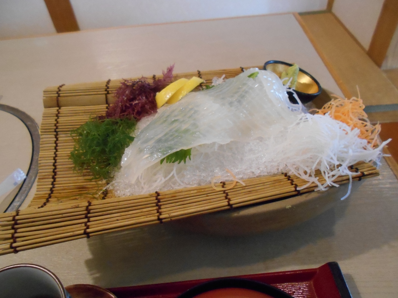 唐津に来たので、イカ造りの刺身を食べようと思い唐津城近くのお店を調べたら『玄洋』が徒歩で15分と出たので行ってみました。行くときは遠く感じました。お店はきれいで立派間お店でした。メニューを見て“イカ造り御膳”を注文しました。イカ刺しコリコリとして美味しかった。御膳は、ご飯・茶碗蒸し・シュウマイ・うどんがついて美味しかった。この店に来て良かったです。