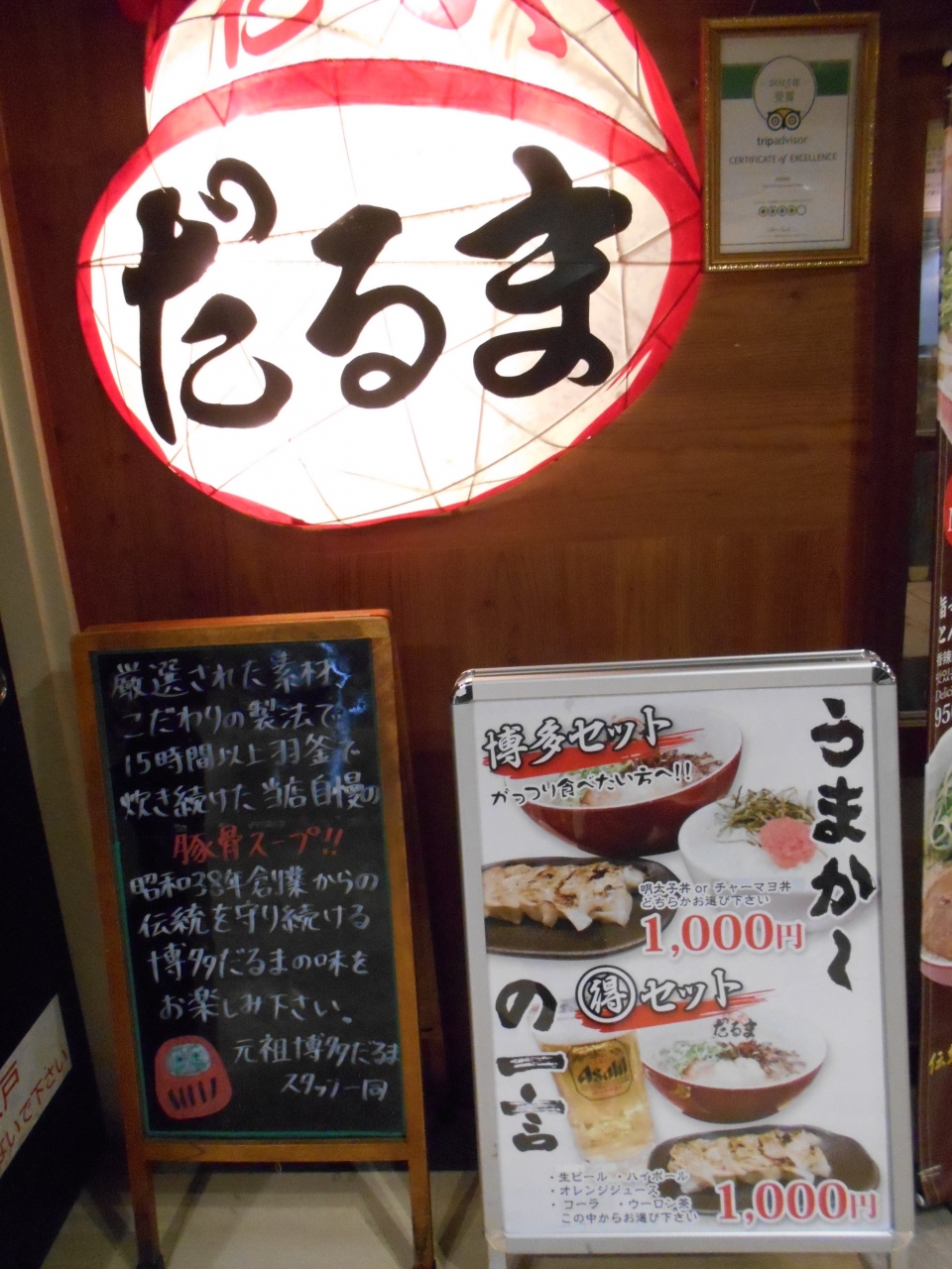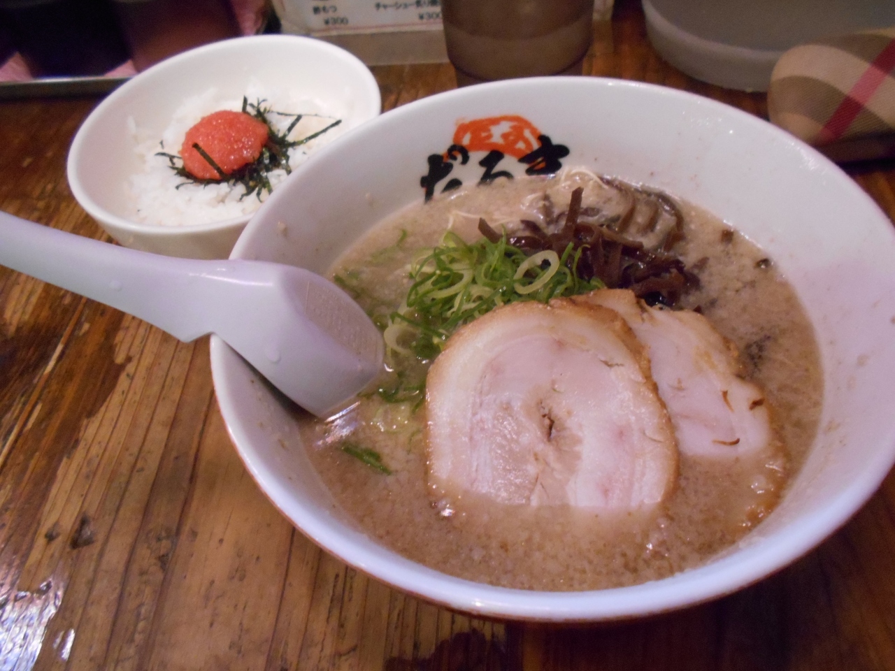 博多駅からすぐ、ホテルからもちかかったのでラーメン街道で食べました。一日目は行列が出来ていたのであきらめ、二日目はすぐに入れたので豚骨ラーメンと明太ご飯と餃子のセットを食べました。ラーメンの豚骨の臭いが強くて・・・。でも、食べるとあまりこってりしていなくて臭いも気になりませんでした。とってもおいしくて替え玉を注文しました。ご飯も、餃子もおいしかったです。行列ができるのも分かります。