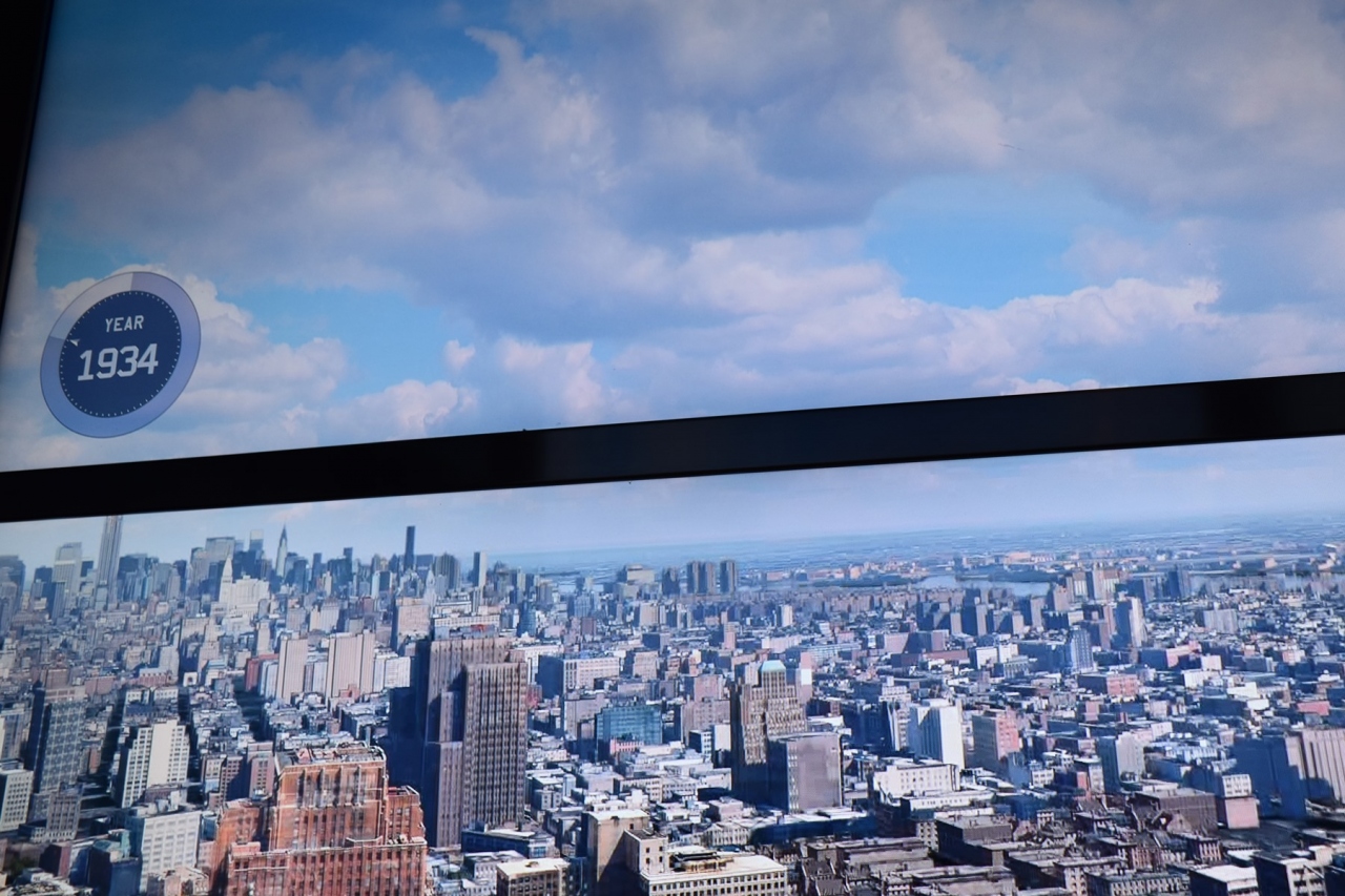 自由の女神とワン ワールドトレードセンターのツアーに参加をして、最後にワールドトレードセンター展望台へ行きました。ツアーだったので、チケットを購入するために長蛇の列に並ばず、すぐに展望台のエレベーターに行って乗ることが出来ました。エレベーターは何台もあるので、あまり待つことはありませんでした。このエレベーターの中がすごかった。アメリカが出来るまでの映像が壁・天井一面に写り出されます。到着してエレベーターから出ても映像でいつ展望室に行けるのかと思っていると前の壁が割れて上がっていくとニューヨークの街が出てきます。なんとも洒落ていました。
