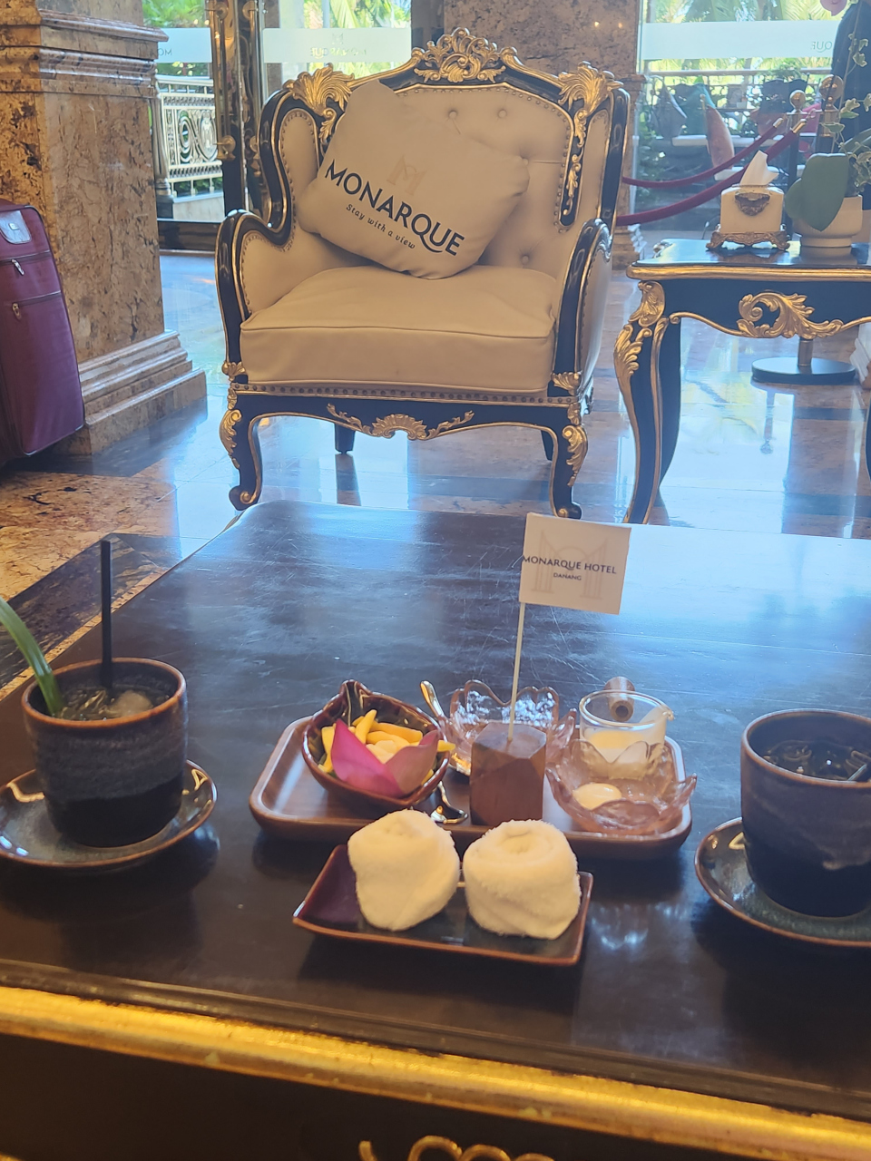 ウェルカムドリンクがドリンクだけでなくゼリーやドライマンゴーなどもセットで。