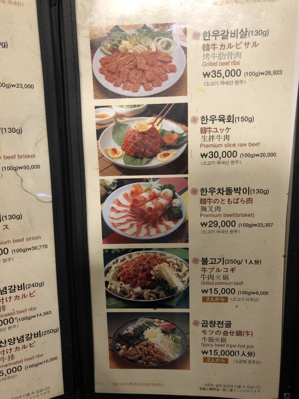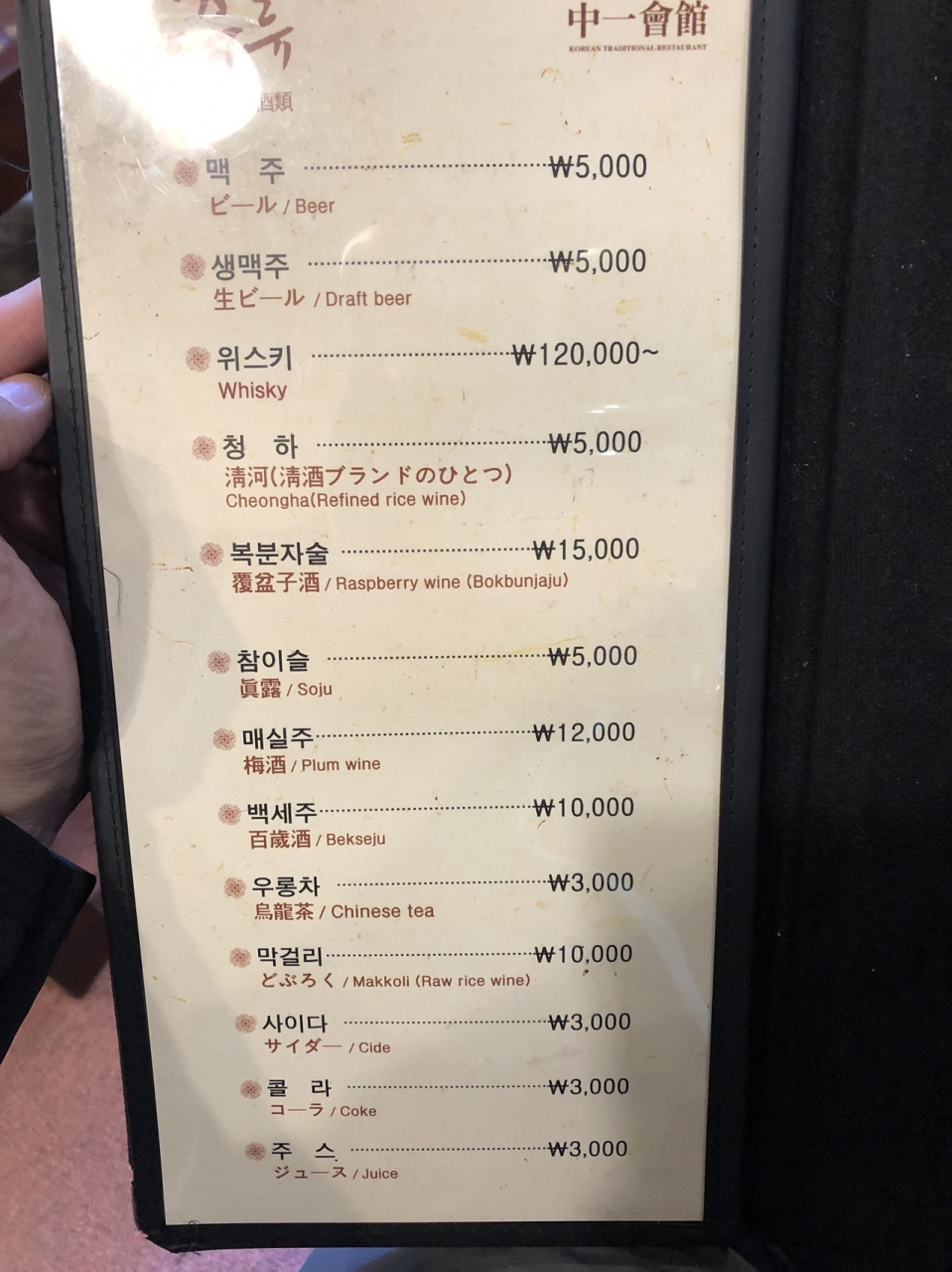 久しぶりにソウルに行くことになり、美味い焼肉が食べたかったので、現地のツアーガイドに教えてもらいました。「中一会館というお店で、予約しないと入れなくて、ちょっと高いけど美味しいですよ、送迎もしてくれますし」との事でしたので、早速予約をしてもらいました。予約の時間より少し早くお店に入り、テーブルを用意してもらいました。早速お肉を注文し待っていると、店員さんが焼いて取り分けくれるので、食べやすいのですが、自分のペースで食べたいなと思いました。けれども久しぶりに本場の焼肉は美味しかったです。支払い後にはホテルまで送ってもらいました。