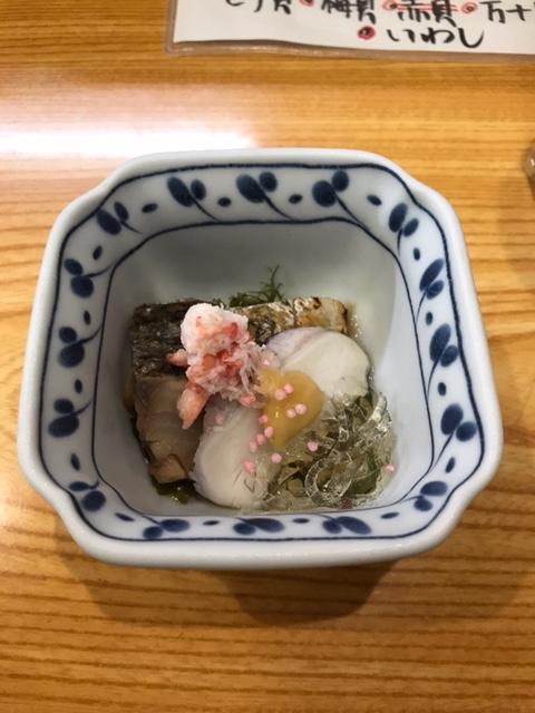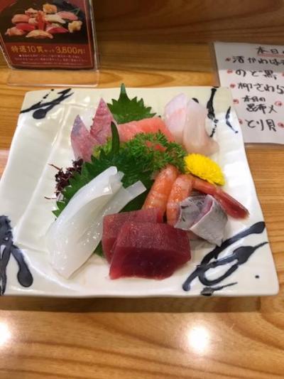 入り口から店内が見えないので、ちょっと戸を開けるのに勇気がいりましたが、店内は明るくローカルなお寿司屋さんという雰囲気です。カウンターに通していただき、本日のおすすめの刺身(一人前)、スルメイカの沖漬け、ビールをいただきました。