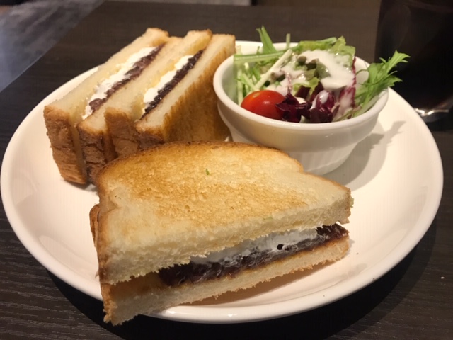 名古屋に来たんだったらやっぱりモーニングは食べなきゃと思い、訪れたお店。名古屋駅から徒歩2~3分といったところでしょうか。店内は広々としいて、清潔感のある落ち着いた雰囲気です。今回注文したのはモーニングCセット(あんこサンド+ミニサラダ)、飲み物はアイスコーヒー、合計700円です。