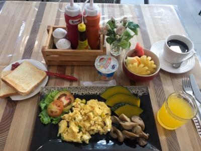 冷蔵庫はありませんが、一階にペットボトルのお水が入った冷蔵ケースがあり、宿泊者は何本でも無料で持ち出し可能です。朝ごはんもついていて、カウンターで好きなタイプの卵料理を注文して、ホテルの方が席まで運んでくれます。フルーツ、ヨーグルト、パンなどが付いてこの宿泊費はコスパ最強だと思います。