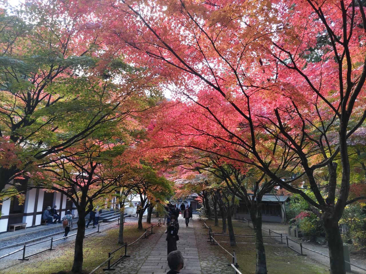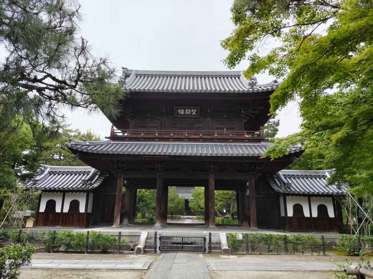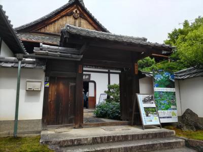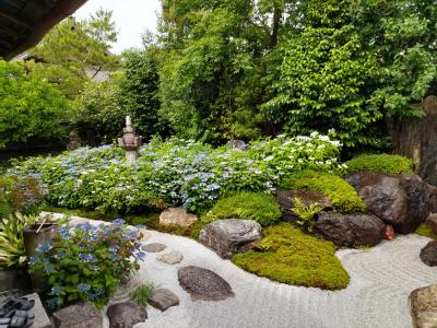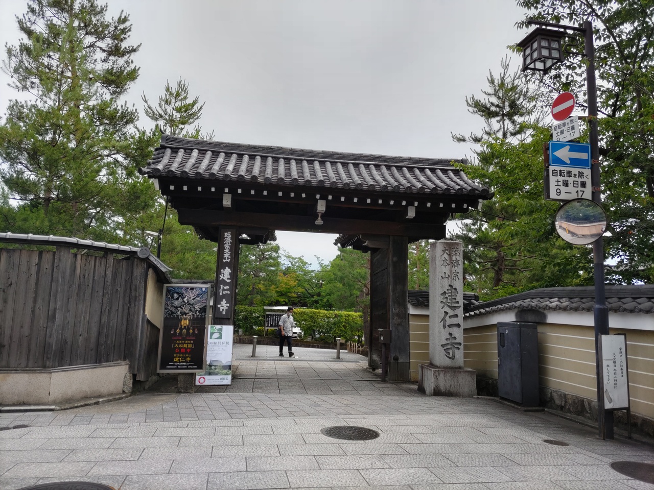 建仁寺の中にある塔頭寺院、霊源院は一休さんや今川義元が修行をしたところです。織田信長の直筆書状が展示してありましたが、撮影はNGです。お庭は枯山水庭園で「鶴鳴九皐(かくめいきゅうこう)」と名付けられています。鶴は深い谷底で鳴いてもその声は天に届く。つまり、賢人は身を隠してもその名声は広く世間に知れ渡るというたとえで、聖者(釈迦)の教えは世界に広まるという意味なのだそうです。お庭と天井の龍図は撮影可能です。お庭には下りて写真が撮れます。お寺の方がいろいろと説明してくださる中で、お庭に咲いている花はガクアジサイだと思っていたのですが、アマチャだと言われ驚きました。調べてみると仲間ですが、アマチャの葉は細長く「甘茶」として飲用可能ですが、アジサイの葉は丸みを帯びていて毒があるのだそうです。間違えたら大変です。天井の龍図は皆さんが寝転がって写真を撮っていました。