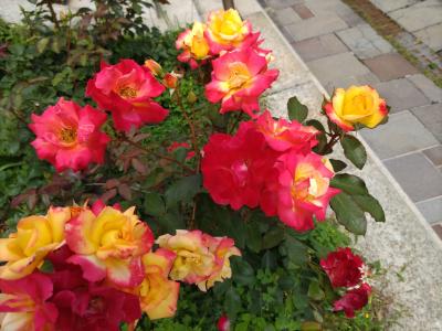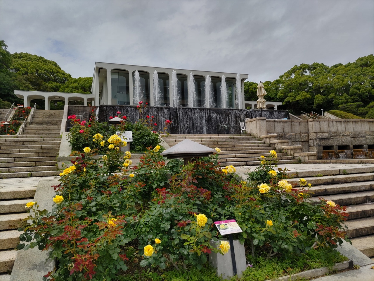 須磨離宮公園は山陽電鉄の月見山駅で降りると便利です。駅に「バラの小径を通れば最短です」と案内があります。道路に描かれた薔薇の絵を辿って歩いていくと、迷うことはありません。10分くらいの距離でしょうか。入園料も400円と安く、アスレチック場があり、家族連れがお弁当を持って一日遊べる造りになっています。私達が行ったときは薔薇が咲き、ヨーロッパの宮殿のようなレストハウスから流れ出る水が段々の滝を作り、下で噴水となっていてまるで、ウィーンのベルヴェデーレ宮殿のようでした。植物園の方では花しょうぶが満開でした。秋の薔薇の季節も見事でしょうね。薔薇の咲く季節に訪問されるとよいと思います