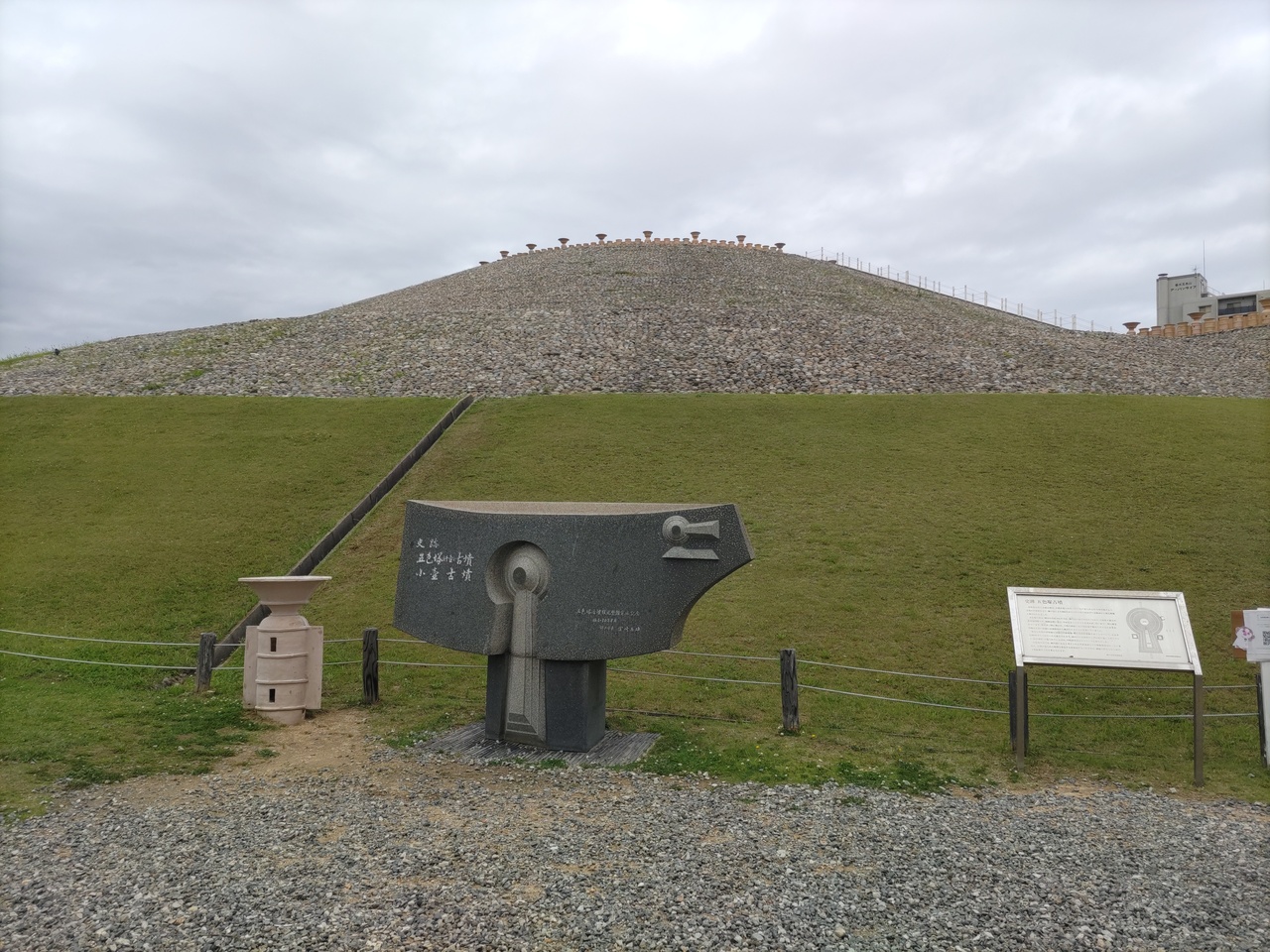 五色塚古墳は、山陽電鉄の垂水駅で降りて歩いて15分くらいのところにありました。兵庫県では最大の前方後円墳だそうです。駅近くに標識が出ており、住宅街の中を標識に沿って歩くとたどり着きました。近くに無料の駐車場もあります。事務所に職員の方がおられ、県名市名と人数を記入して無料で入れます。事務所内には土器などの出土品が並べられています。歩いて古墳の上にあがると、目の前は海で、明石海峡大橋がよく見えます。とても眺めの良い高台に建つ五色塚古墳は、誰が埋葬されたかわかっていないようですが、古代のロマンを感じる場所です。