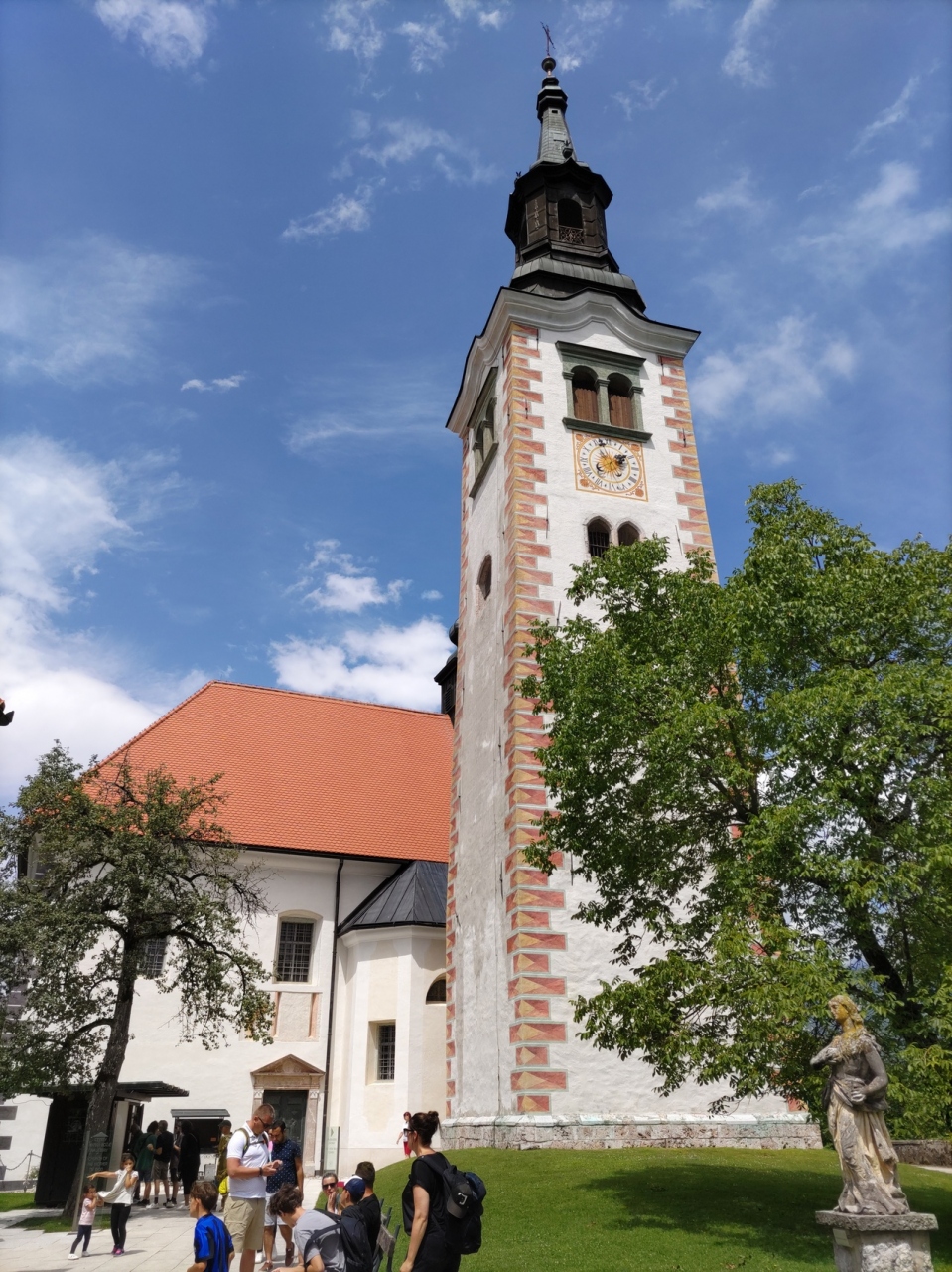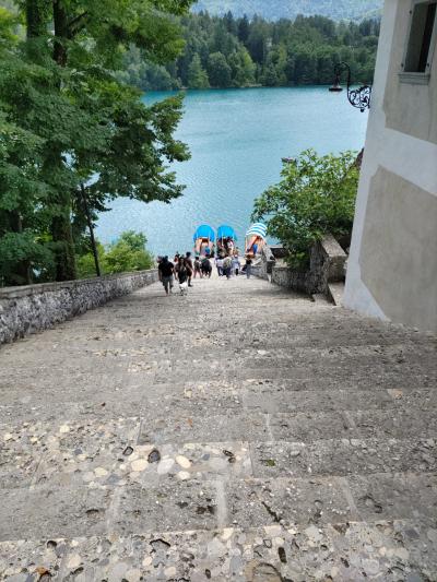 ブレッド湖の中にあるブレッド島に建つ、小さな教会です。プレトナボートという手漕ぎボートに乗って島に近づくにつれて見えてきます。ボートが島に着くといきなり目の前に99段の階段があります。聖マリア教会で結婚式をするカップルは、新郎が新婦を抱き上げてこの階段を上るそうです。上りきると幸せが待っていると言われているようです。私達が行ったときには結婚式は行われていませんでした。教会には時計塔があり、教会内部にも入れるようになっていました。