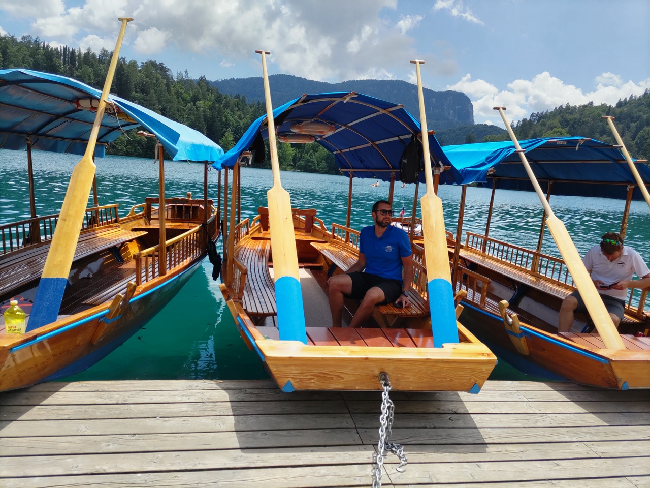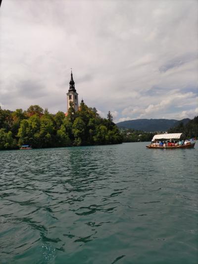 ブレッド島に行くには、自力で泳いで行くか、このボートに乗るか、ぐらいしか方法がありません。プレトナボートは島へ渡る唯一の交通機関ではないでしょうか。乗り場は2か所あるようですが、私たちは湖の南側、ブレッド島に近い方から乗りました。ボートは環境保護のためかエンジンは付いておらず、筋肉質の男性たちが2本のオールで漕いでいます。彼らは代々漕ぎ手を継承していて、元々権利を与えられた23家族の子孫にしか漕ぎ手になることはできないそうです。20人くらいが乗れますが、バランスが大事で、乗り降りの時は左右交互に乗り込んだり立ち上がったりしなければなりませんでした。