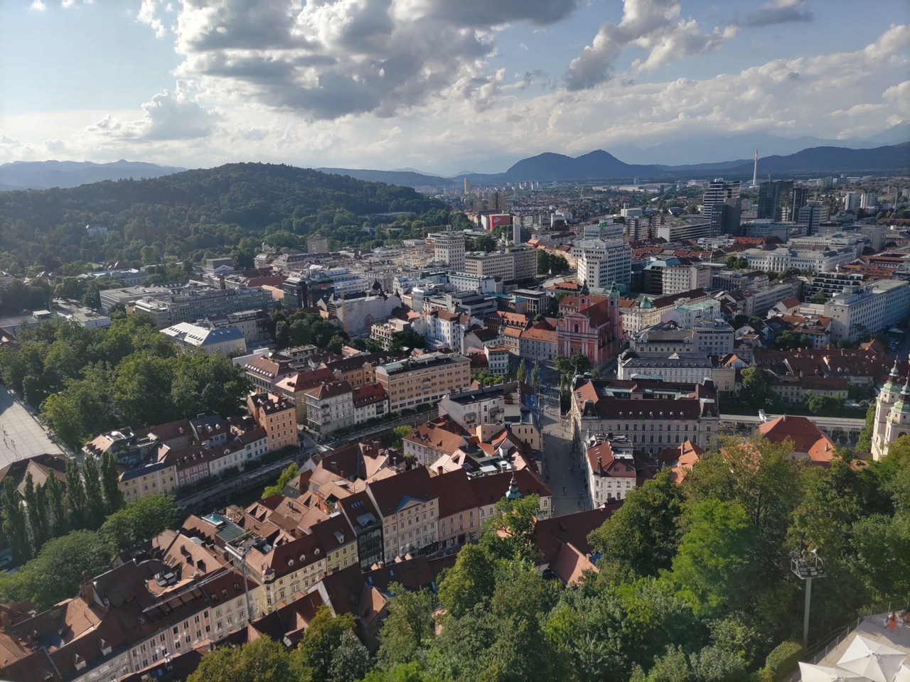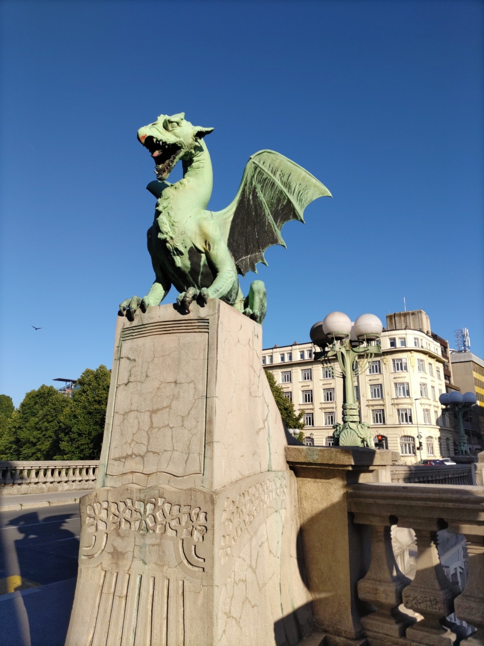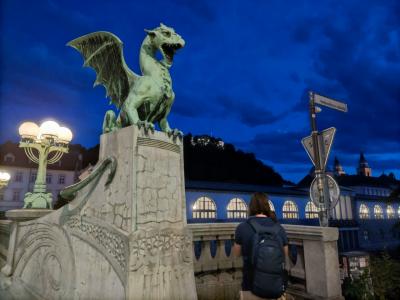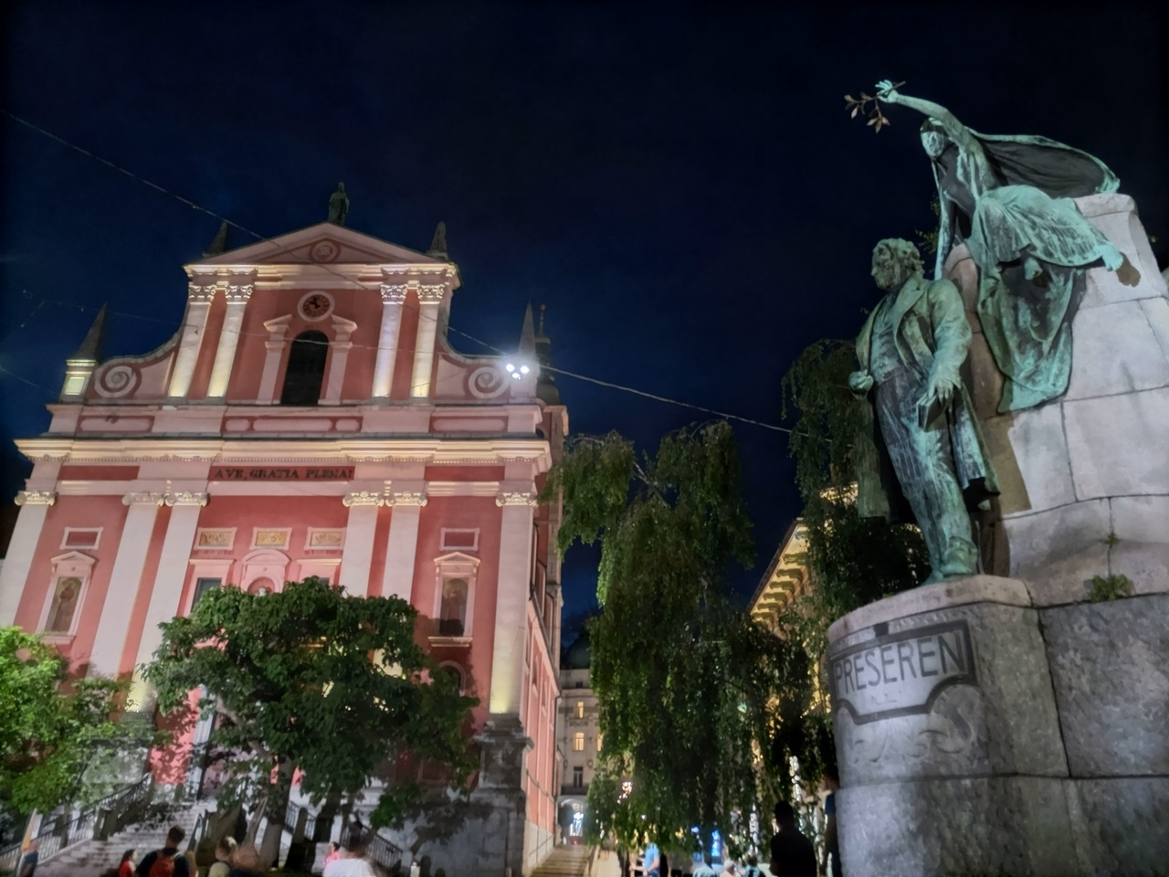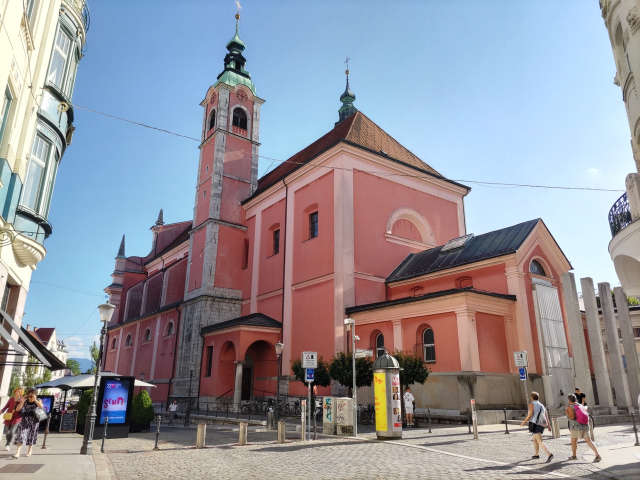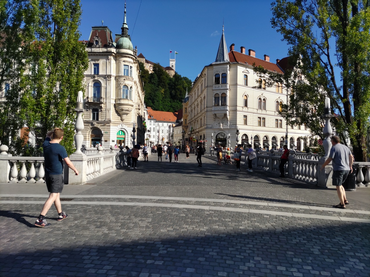 旧市街の中心プレシェーレン広場の前を流れるリュブリャニツ川に架かる橋のひとつです。真ん中に車の通る橋、その両側に歩行者用の細い橋が架かっています。3本が平行には架かっていないように思いました。ドローンか何かで撮るとよくわかるのでしょうが、三本をうまく写真に収めることはできませんでした。しかし、北側には聖フランシスコ会教会、南側にはリュブリャナ城があるのでそれらと一緒に写真を撮るとよいかもしれません。