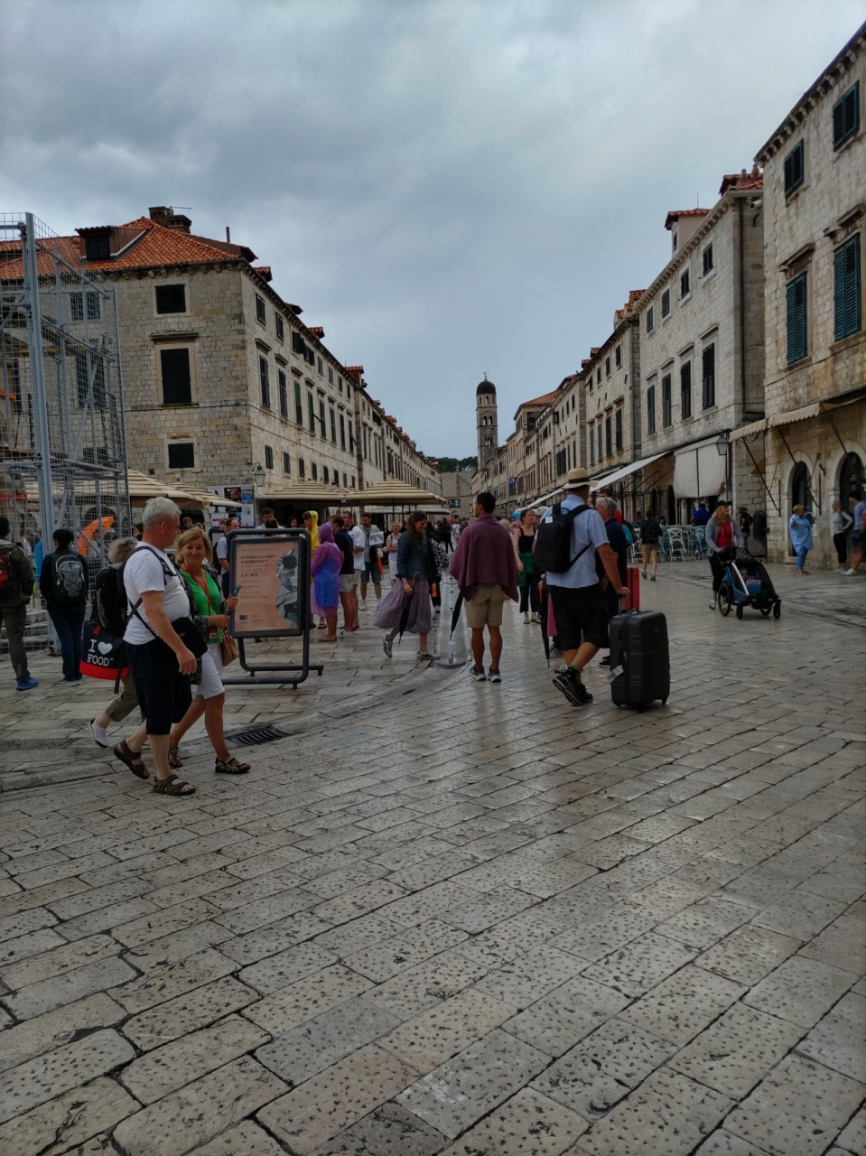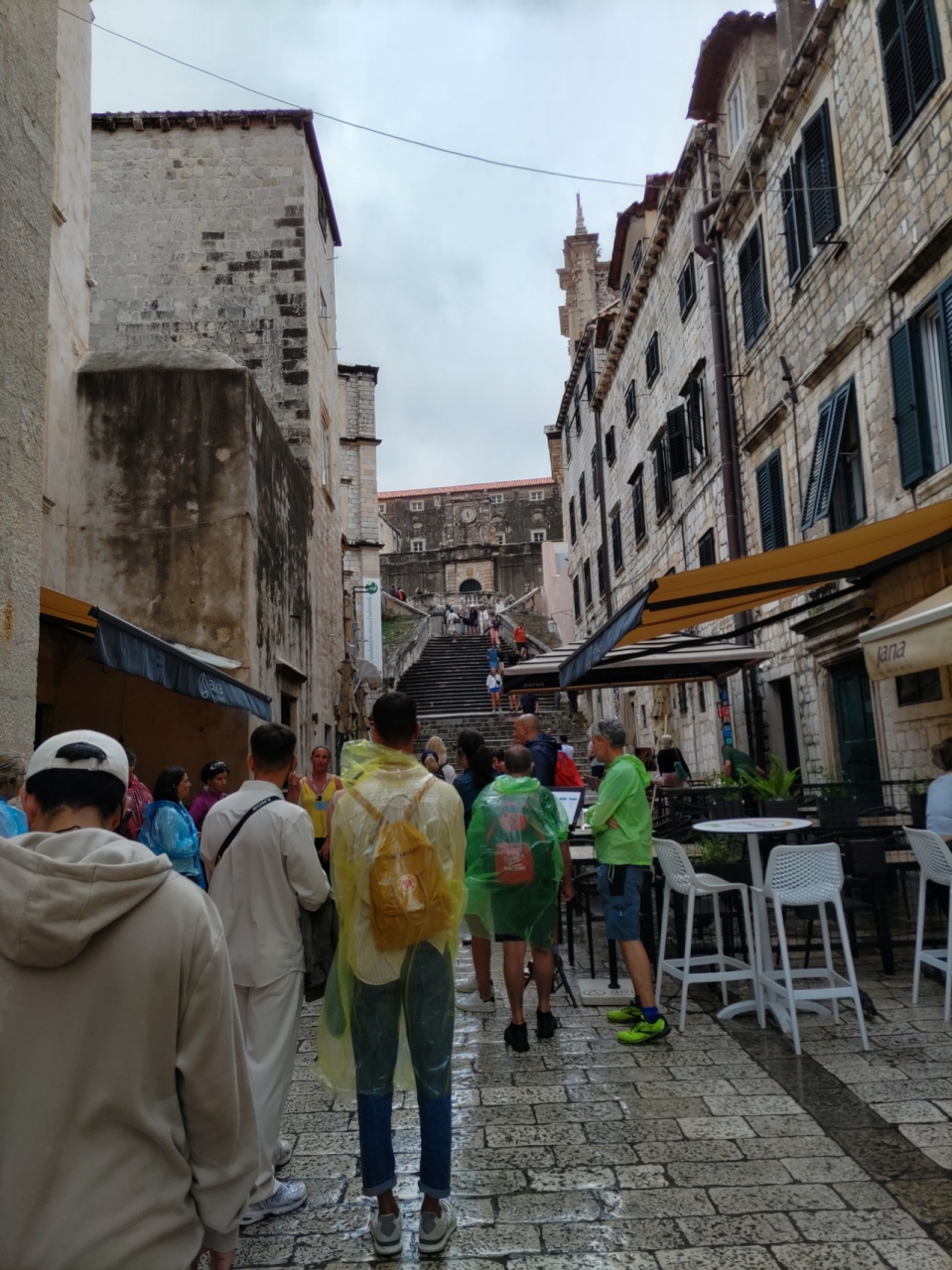 遠くから見るドブロブニクの旧市街は、オレンジ色の屋根が連なり、アドリア海の青い海との色彩のコントラストが秀逸です。まさに「アドリア海の真珠」と呼ばれるにふさわしい景観に心が躍ります。門をくぐって旧市街に入ると、メインの短いストリートを中心に縦横に小径が続き、まるで迷路のようです。北側(スルジ山側)は階段が続き、あちこちにカフェやお土産物屋がありました。南側(海側)は多少起伏がありますが、ほぼ平坦です。古い教会や海洋国家として繁栄していた頃の重厚な建物など見どころが詰まっています。また、通りの壁面には紛争時の写真があったり、壁に砲弾の跡が残っていたりと、この町の痛々しい歴史も垣間見ることができます。