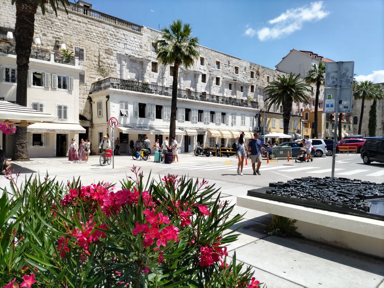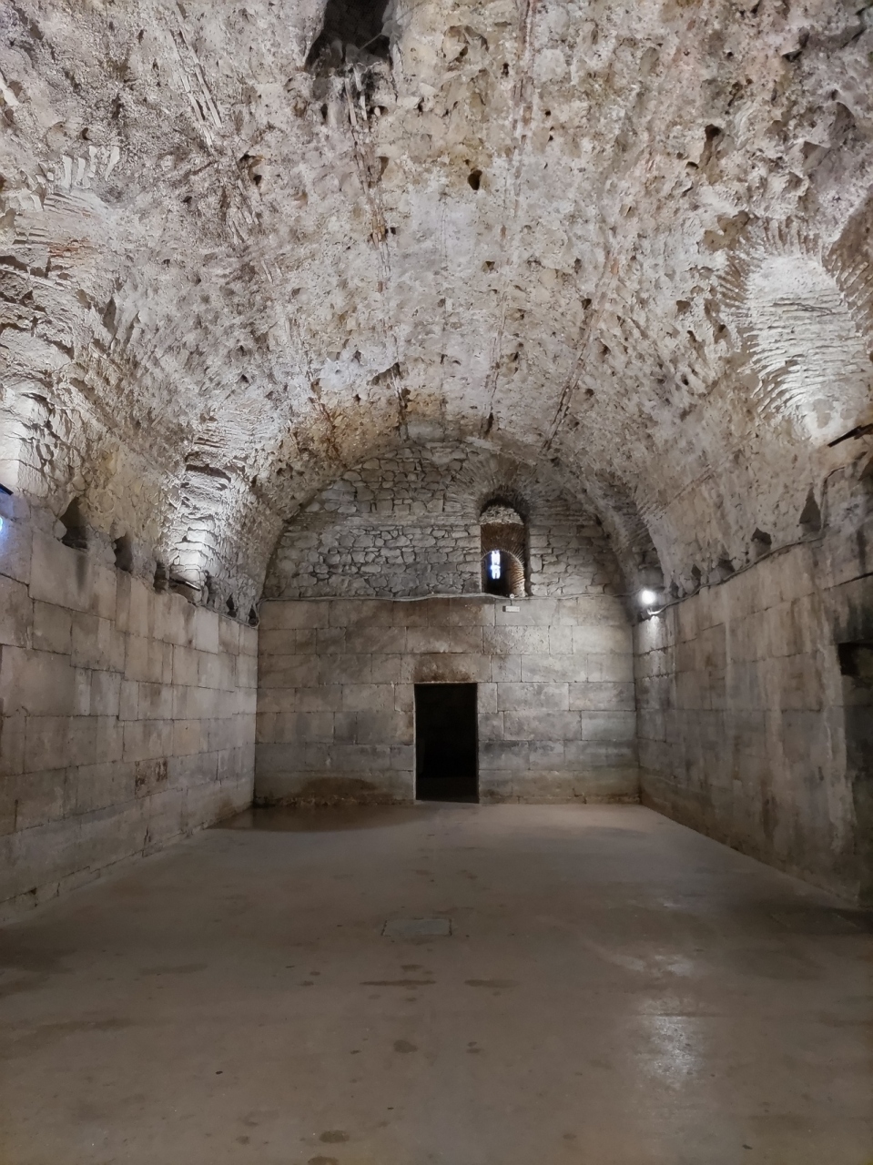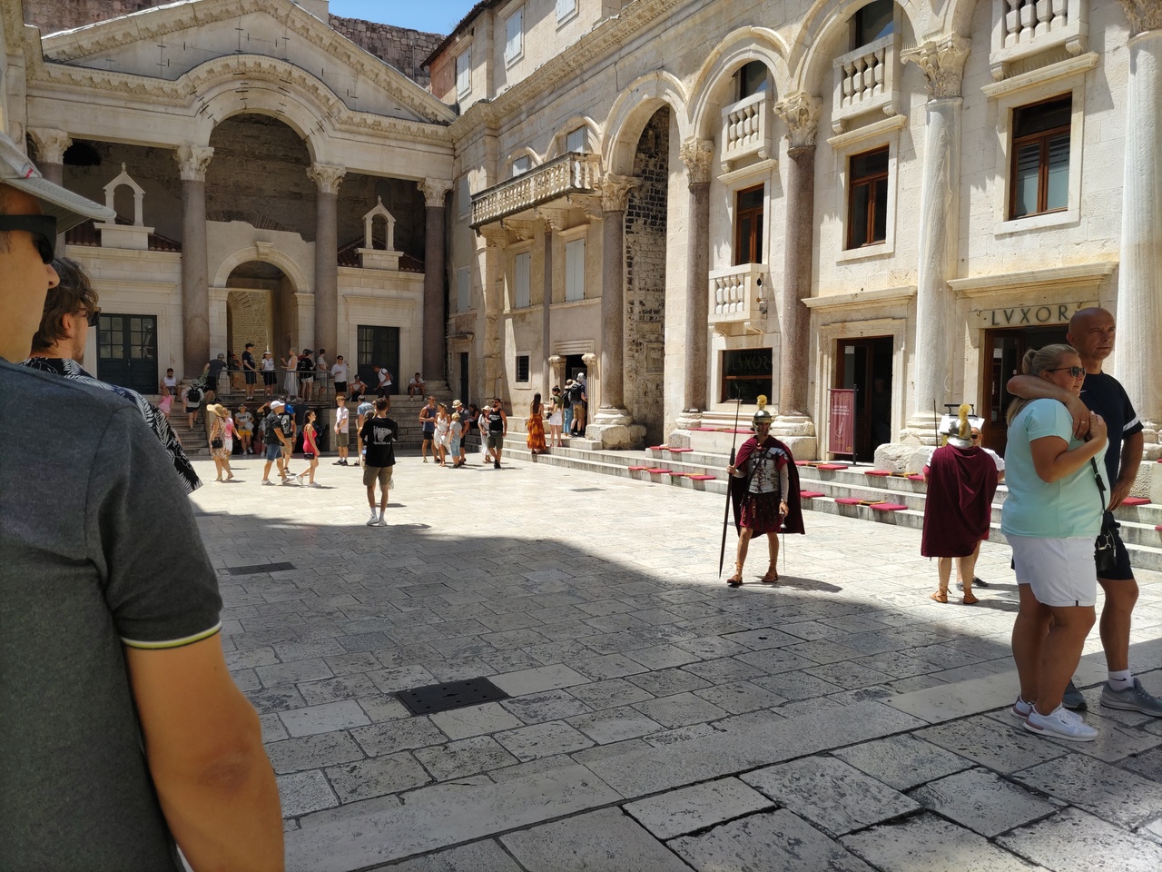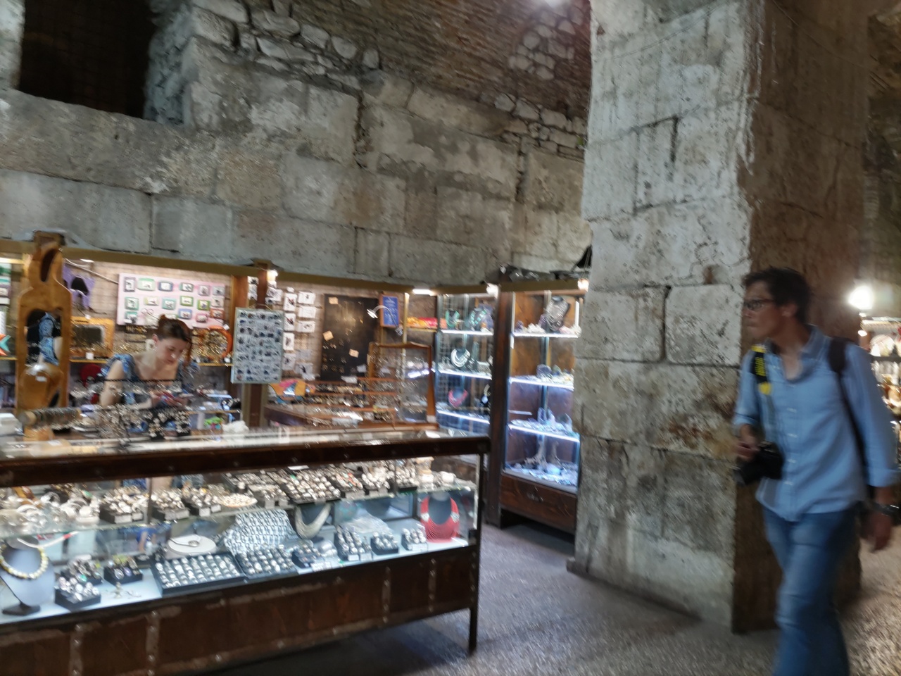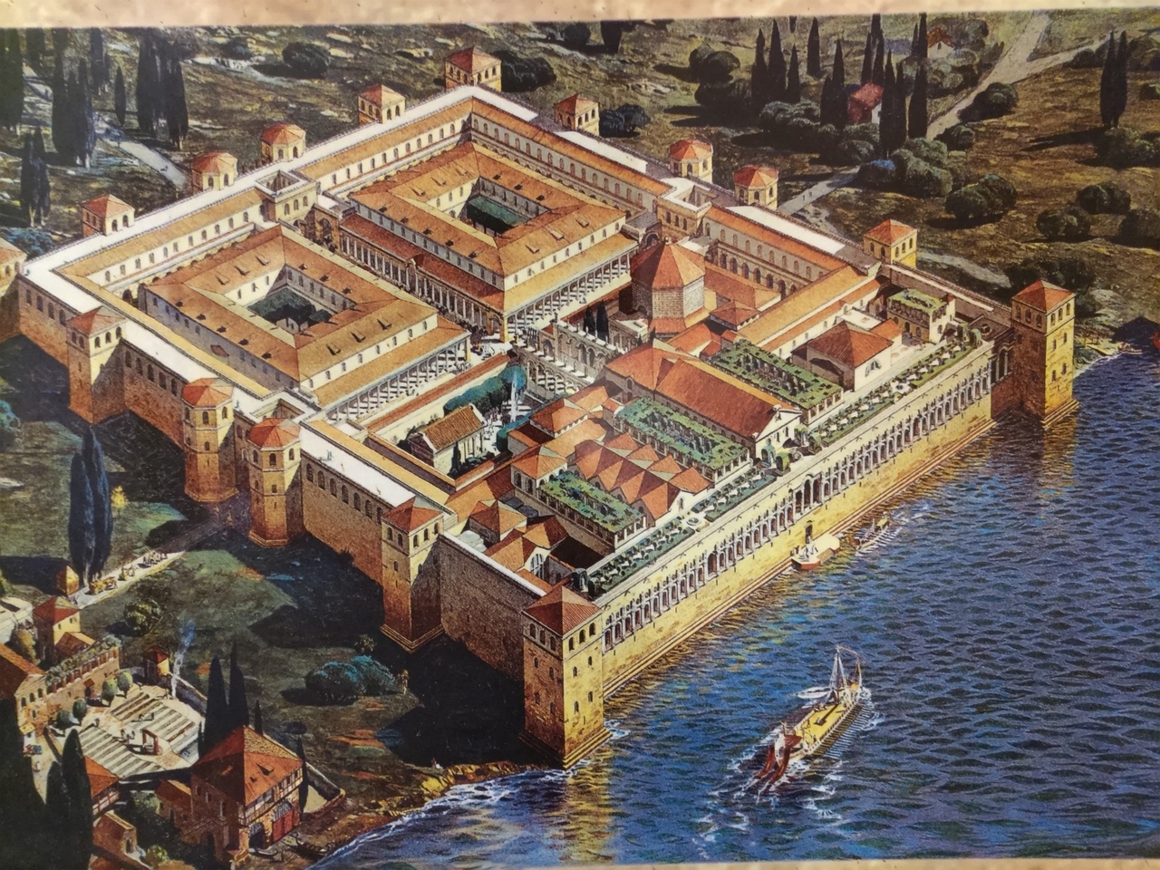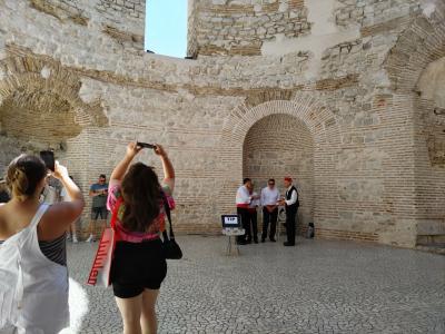 3世紀末から4世紀初頭にかけて古代ローマのディオクレティアヌス帝によって建てられた宮殿が世界遺産になっています。宮殿は破壊と建設が繰り返されて今に至っています。東西南北に4つの門をもち、皇帝の住居だったところやその地下部分貯蔵庫だったところなどを見学することができます。地下の西半分は博物館になっていて有料です。中央の広場、ペリスティルに通じる地下通路の周辺にはたくさんのお土産屋があります。住居だったところの入り口付近に音響効果のあるスペースがあり、運が良ければ男声合唱のクラッパを聞くことができます。