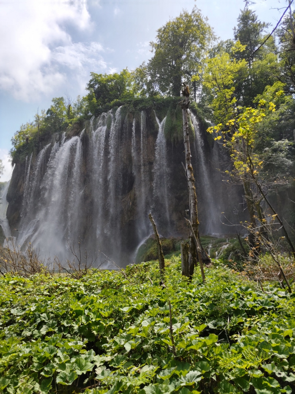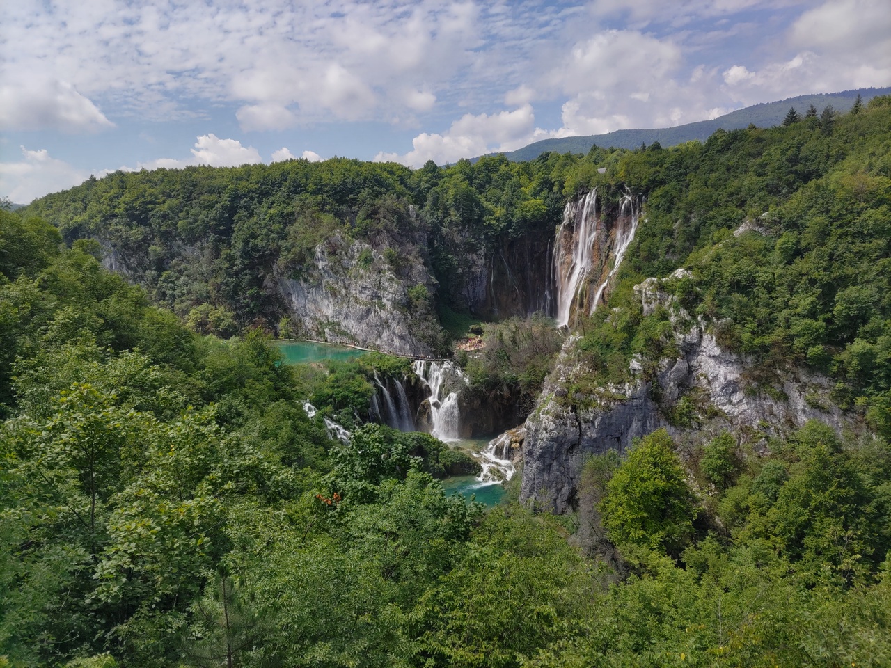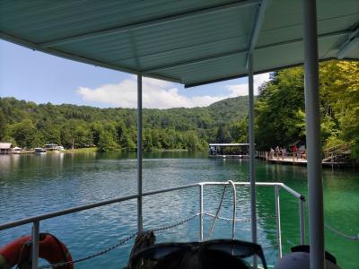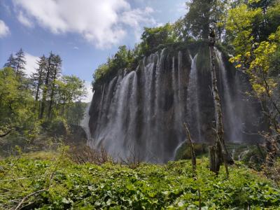 プリトヴィツェ湖群国立公園内で最も大きな滝です。園内表示には「大滝」とあります。高さは、パンフレットには78mとありますが、滝そばの表示板には87mとありました。エントランス1から入ってしばらく行くと、ビューポイントがあり、まずそこから眺めることができます。また、湖面まで徒歩で降りてから遊歩道を行くと、滝のすぐそばにたどり着きます。私たちは7月初旬に行きましたが、水量は少なめだと思いました。遊歩道に下りていくまでにも眺めることができ、どこから見ても大自然の中の美しい滝だと思います。