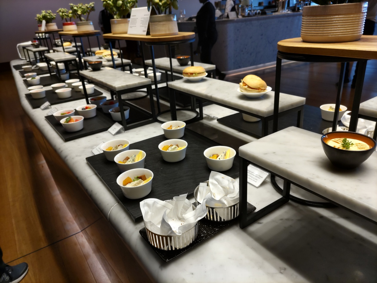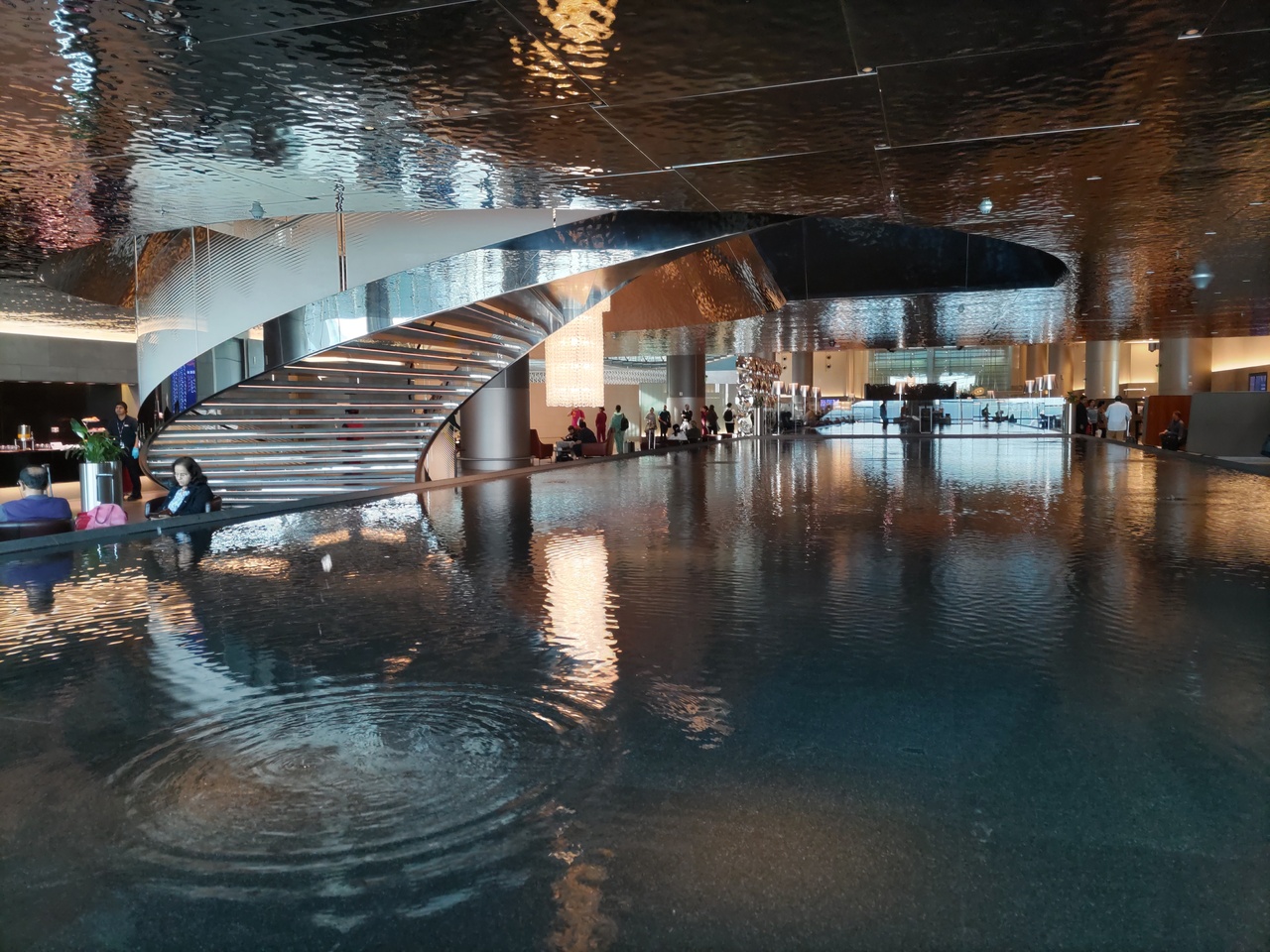 ドーハ国際空港のビジネスクラス利用者等のラウンジです。エスカレーターのところでスタッフにフライトチケットを見せてエスカレーターに乗り上がっていきます。中に入ると目に飛び込んでくるのは水をたたえた大きな池。水の乏しい砂漠の国で、これでもかというくらいふんだんに水を使った造りになっています。池を囲むように各種の施設があります。一番奥は広いレストラン。そこからクワイエットルームに行くことができ、帰りの6時間の待ち時間も仮眠ができ、快適に過ごすことができました。人気のようで、予約してしばらく待ってからの利用となりました。シャワールームも大変広く贅沢な造りです。女性用は少し待ってからの利用となりました。トイレもぴかぴかで、常にお掃除の人が入って掃除しています。ゆっくり休む椅子や、仕事用の椅子など座るところはたくさんあり、ゆったりした造りです。階段を上がると広い広い食事スペースになっており、中東の料理を含め、たくさんの料理がずらりと並んでいました。スタッフはとても親切です。