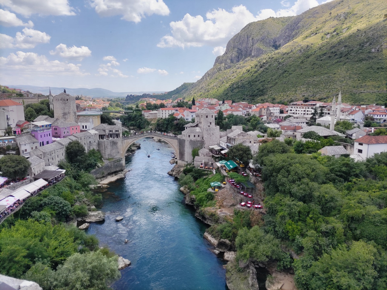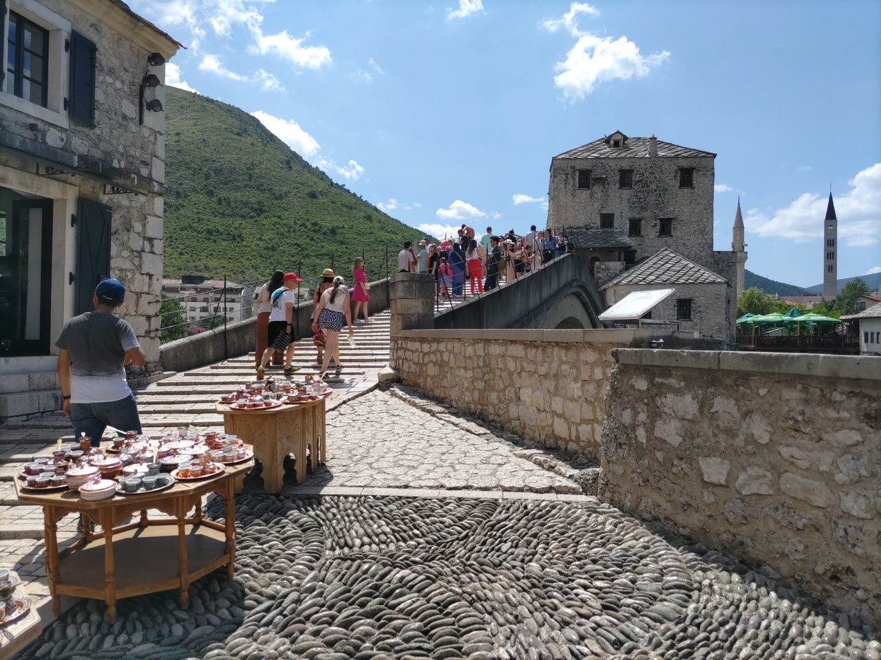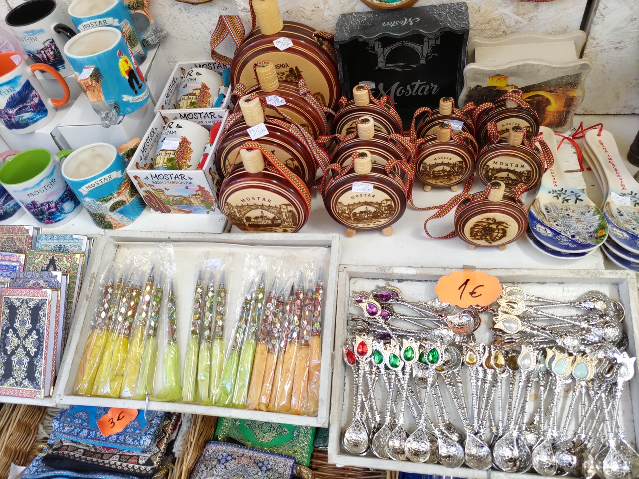 モスタル市内を流れるネレトバ川にかかるスターリモスト。その両側に続くにぎやかなエリアです。西側はクロアチア人が多く住み、教会やカフェ、ヨーロッパ風の建物があります。橋を渡り、東側に行くとイスラム教徒が多く住み、街はトルコ風のお土産物屋が連なり、モスクが多くあり、雰囲気がガラッと変わります。30年前に内戦で街が壊されてしまったことが信じられないほど今は復興し、大勢の人々が行き来しています。様々なお土産が並び、モスタルコーヒーを入れる器具などを手作りしている店などがあり、見て歩くだけでもワクワクします。