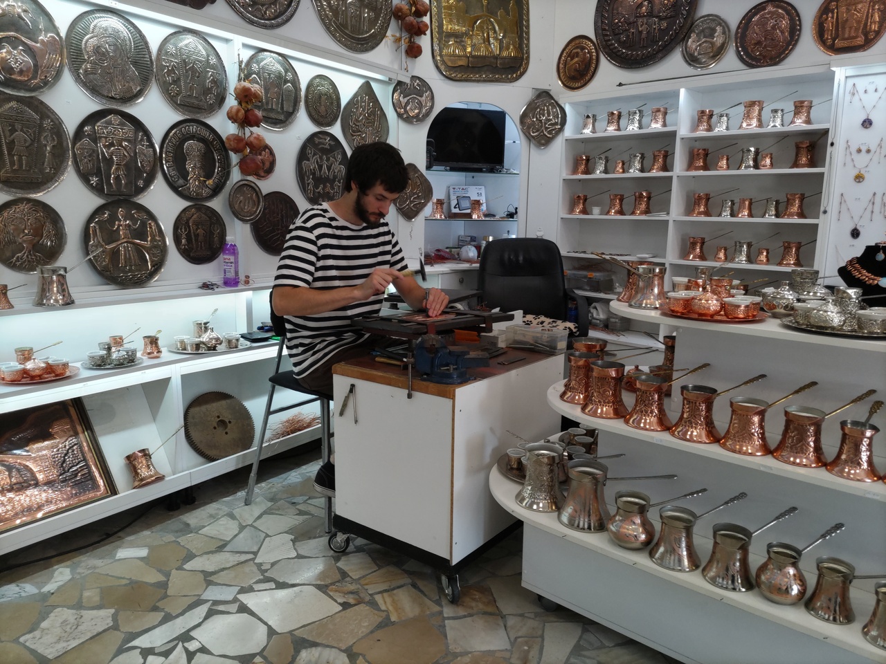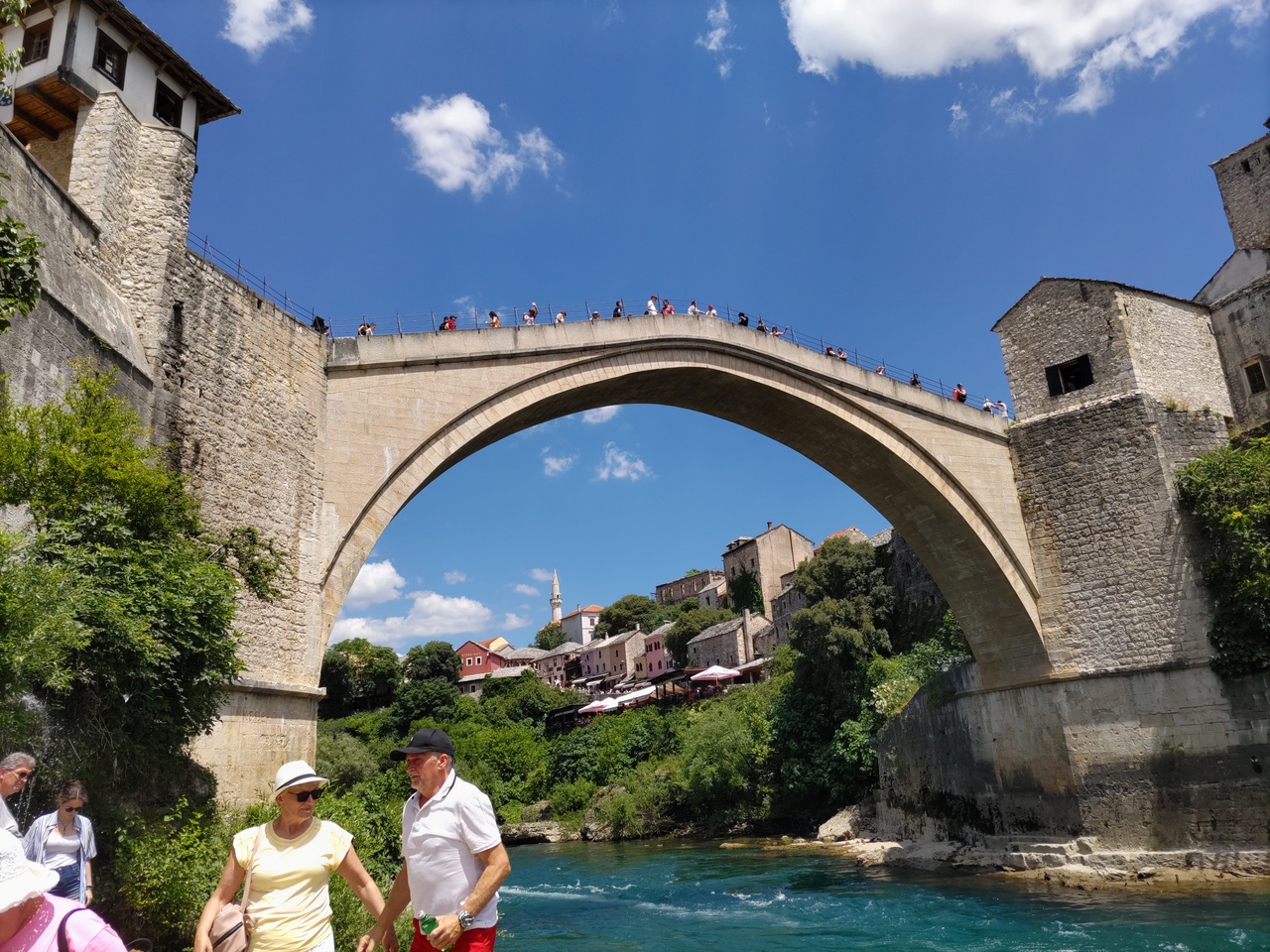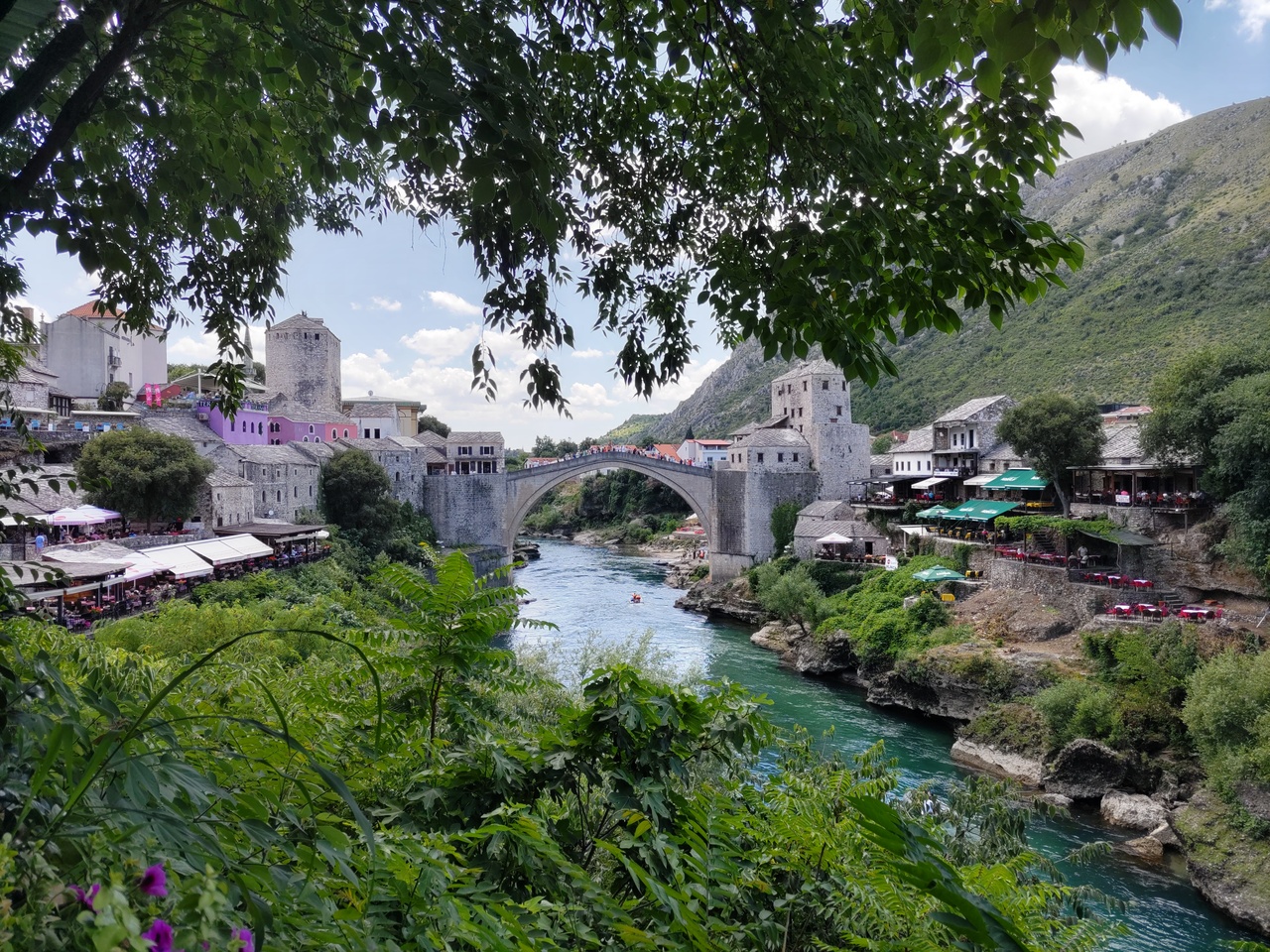 モスタル市内を流れるネレトバ川にかかるスターリモスト。その両側に続くにぎやかなエリアです。西側はクロアチア人が多く住み、教会やカフェ、ヨーロッパ風の建物があります。橋を渡り、東側に行くとイスラム教徒が多く住み、街はトルコ風のお土産物屋が連なり、モスクが多くあり、雰囲気がガラッと変わります。30年前に内戦で街が壊されてしまったことが信じられないほど今は復興し、大勢の人々が行き来しています。様々なお土産が並び、モスタルコーヒーを入れる器具などを手作りしている店などがあり、見て歩くだけでもワクワクします。