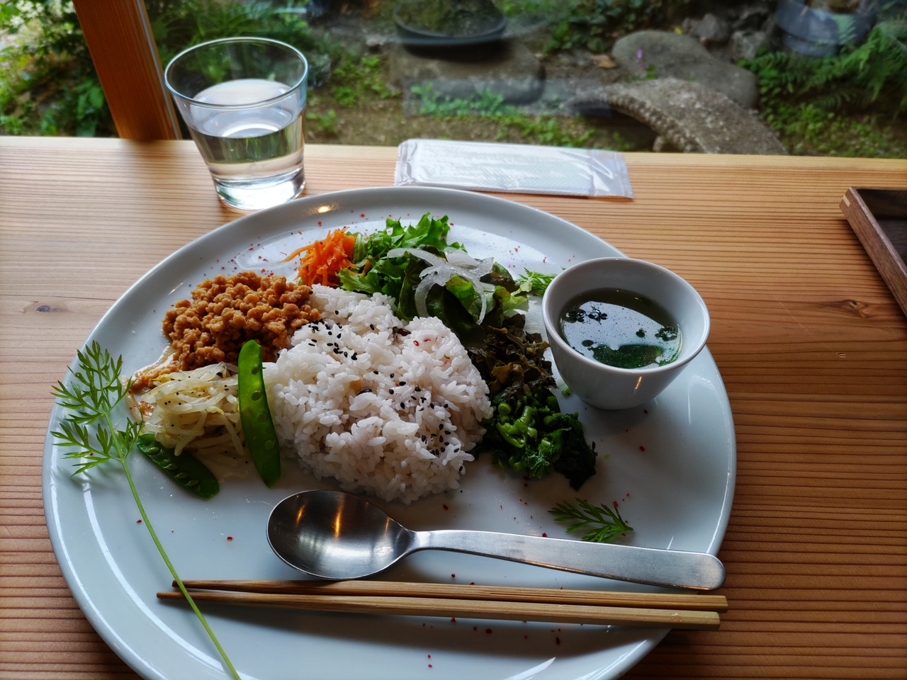 山口駅近く、徒歩5分くらいの場所にある大人気の女子が好きそうなレストランです。平日に行きました。私たちは運良く予約無しで席がありましたが、食べ終えて出るときには、行列ができていました。土日は予約必須でしょう。元々、会社の社員食堂だったのを、一般客向けのレストランにしたとか。この日の「旬膳定食」1650円は鶏ひき肉のジンジャーセージハンバーグがメイン、「旬皿定食」1100円は大豆ミートと旬の野菜を使った混ぜご飯でした。薄味ですが、クミンやターメリックなどのスパイスが効いています。味はまずまず。量は少な目で男性にはもの足りないでしょうね。小さなチョコレートケーキとチーズケーキを買って帰りました。どちらも美味しかったですが、材料にこだわっているせいか、食事も含めて、コストパフォーマンスには欠けるかなと思います。