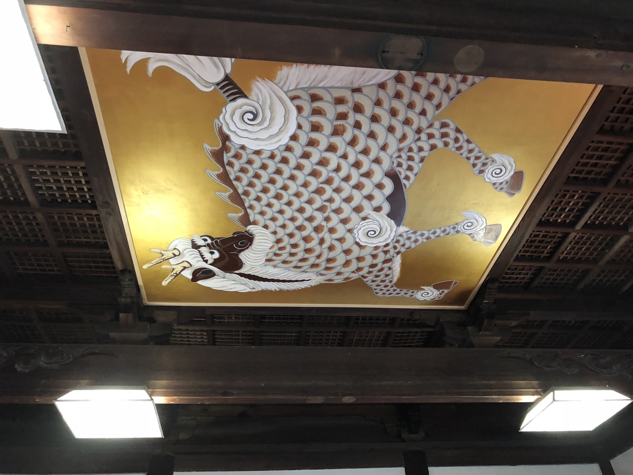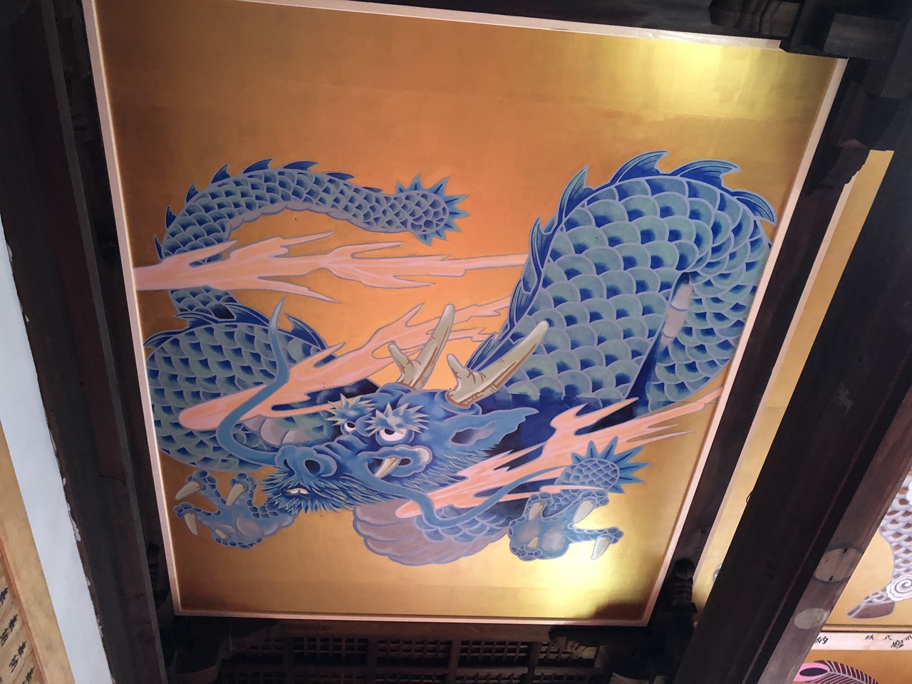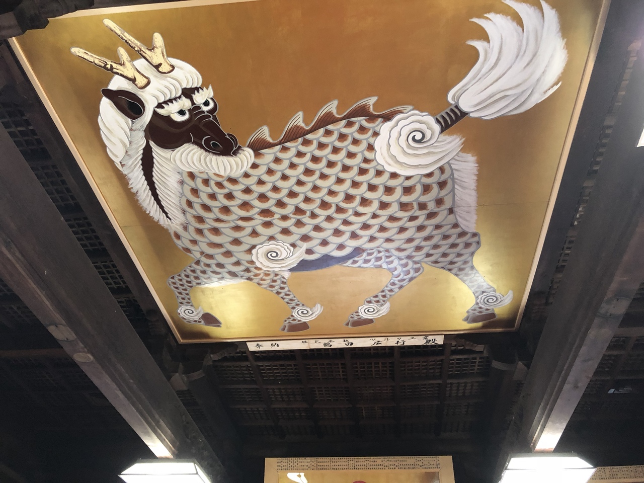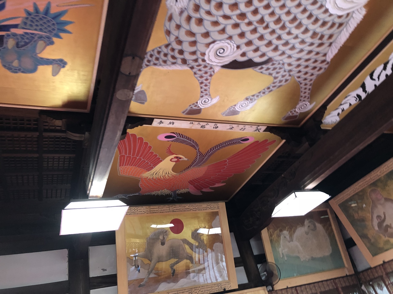 世の中に、天井絵馬が、かなりありなますが、みごたい、十二分、麒麟、青龍、白虎、玄武、孔雀、方位の、5神様が、祀られています。多分、日本一の多きの、絵馬です。吉方の方に、おススメです。最近、出来上がりました。気に入りました。