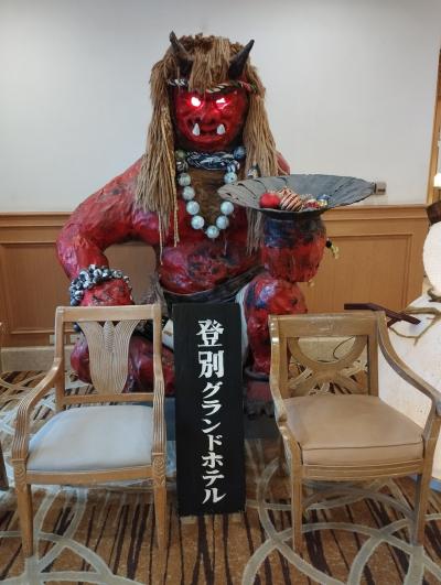 あいも変わらず大きな鬼がお出迎え、目がライトで赤く光っています。