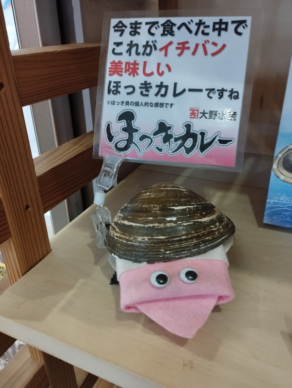 ホッキカレーの宣伝に本物のホッキ貝の貝殻を使ったかわいいキャラクターがいてニンマリ。
