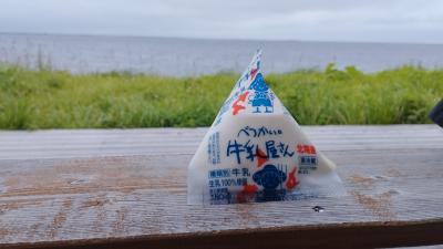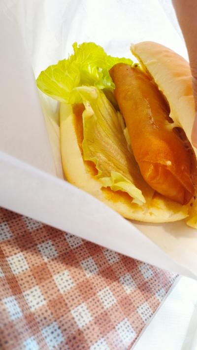 レストランで景色を見ながら名物ホタテバーガーを。この日はチーズが切れていたようで、チーズ無しで100円OFFとなりました。春巻きの皮に包まれたホタテはパリッとジューシーで美味しかったです。