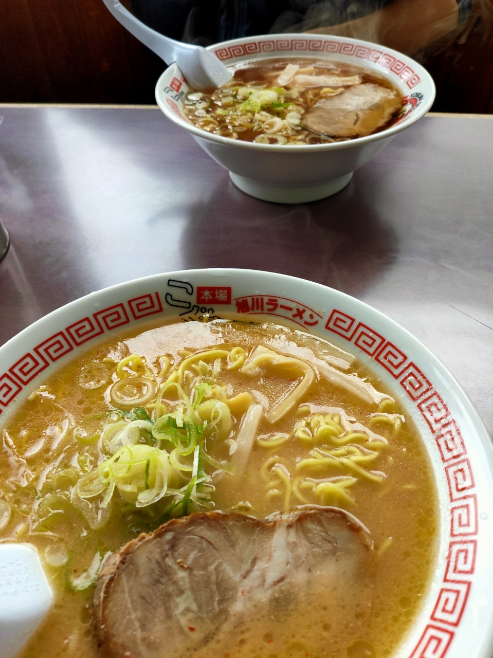 味噌ラーメン・醤油ラーメンを注文。醤油は純粋な旭川ラーメンで癖がなく美味しい。味噌はピリ辛、にんにくが程よく聞いていて、味噌味もきりりとして美味しい。