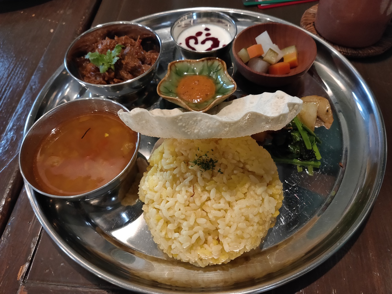 ティハールプレートのチキンとラムを注文。プレートにある色々な具材をライスにかけてグチャグチャにして食べるそう。