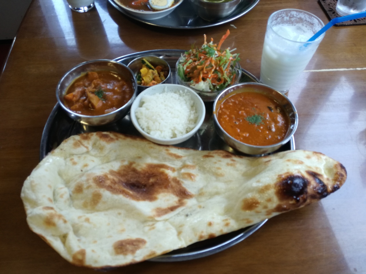 ネパールセットを注文。ナンとライスと2種のカレー、サラダ、ネパール風の漬物のようなもの?がプレートになっています。