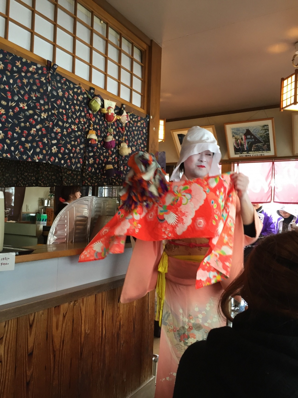 白川郷の中の店舗であたたかいお蕎麦と五平餅をたべていると、七福神の行列がお店に入ってきました!?