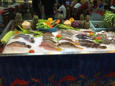 新鮮なシーフード。お店のお兄さんがお魚やロブスターなど色々勧めてきます...