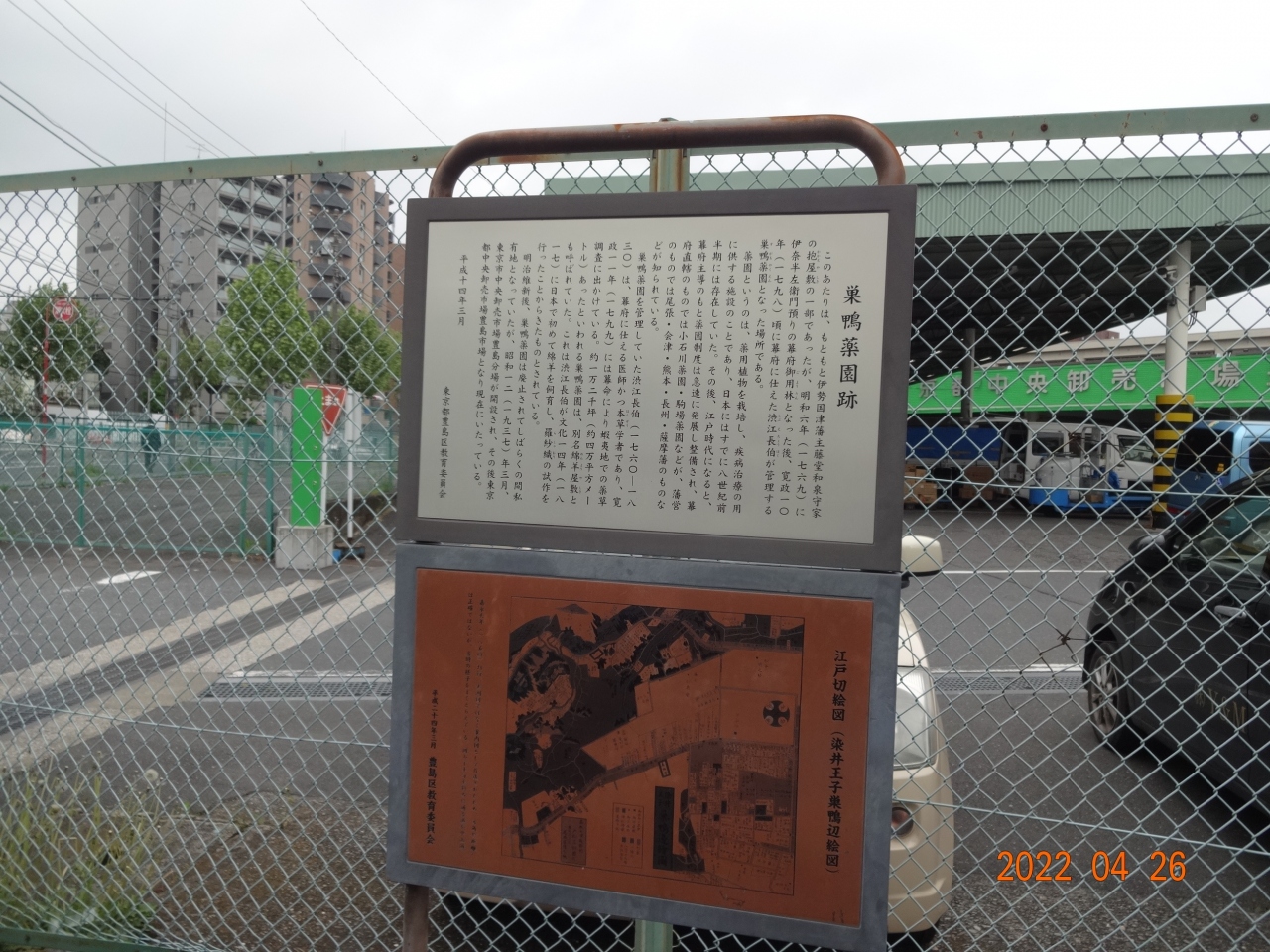 東京都の中央卸売市場の南側のネットに、以前、この場所に、巣鴨薬園があったという解説と昔の地図が掲示してありました。