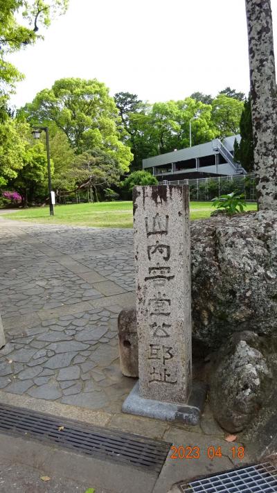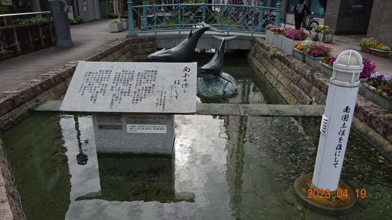 はりまや橋公園の中にありました。はりまや橋交差点の近くです。池なのか水路なのか川なのか、よくわからないのですが、池のような場所の中にイルカの像がありました。そばに、南国土佐を後にしての歌詞が石碑に刻まれていました。ペギー葉山記念植樹と書かれた花壇がそばにありました。